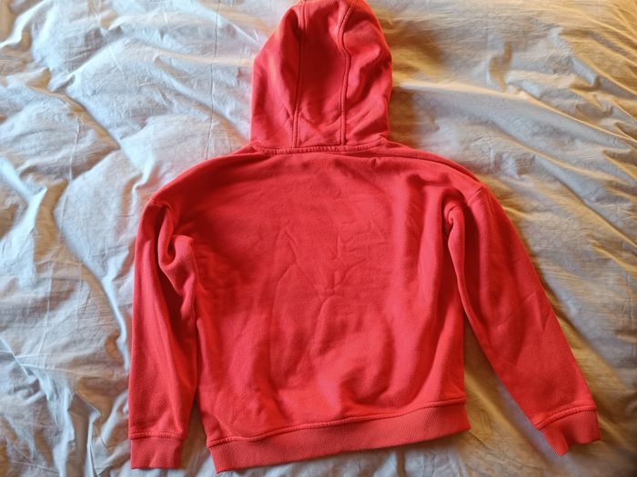 Sweat à capuche orange vif, écriture et dessin Minecraft sur la poitrine. Poche ventrale. Pas d'usure particulière, très bon état.