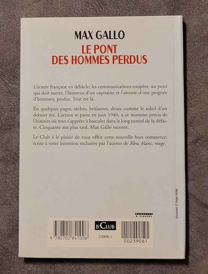 Bonjour, Je vends ce livre nommé - Le pont des hommes perdus Max GALLO - en très bon état. Si vous rechercher un livre ou un acteur en particulier et pour gagner du temps, n'hésitez pas à me le demander, je vous répondrais dès que possible 😇 Veuillez vous abonner pour recevoir toutes les nouveautés Pour autres infos n'hésitez pas à me contacter. ***** Merci de votre visite *****