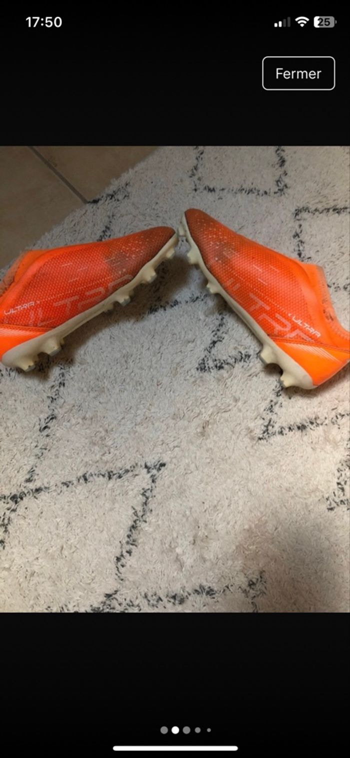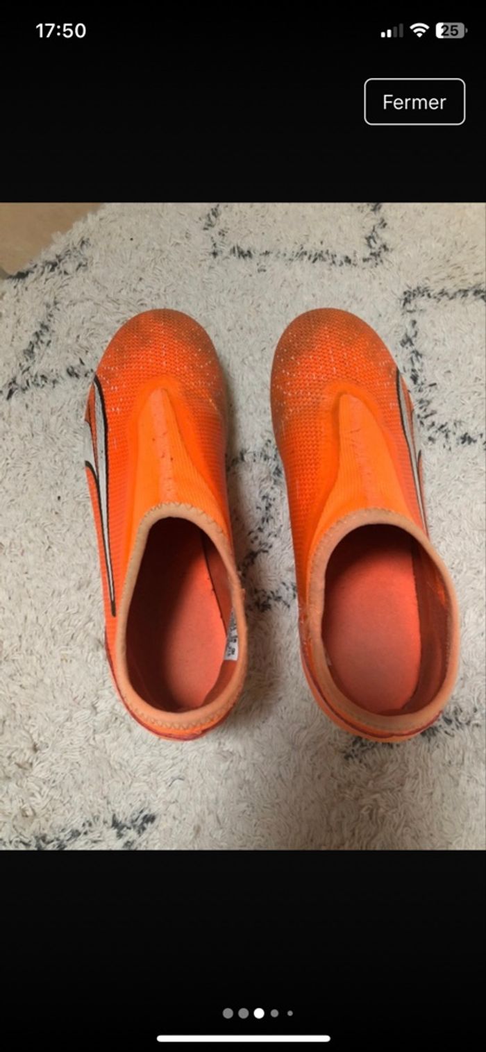 Vends une paire de chaussures de foot Puma T 35 en bon état.Les chaussures ont été lavées mais le devant reste noirci(voir photos)