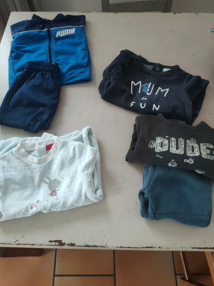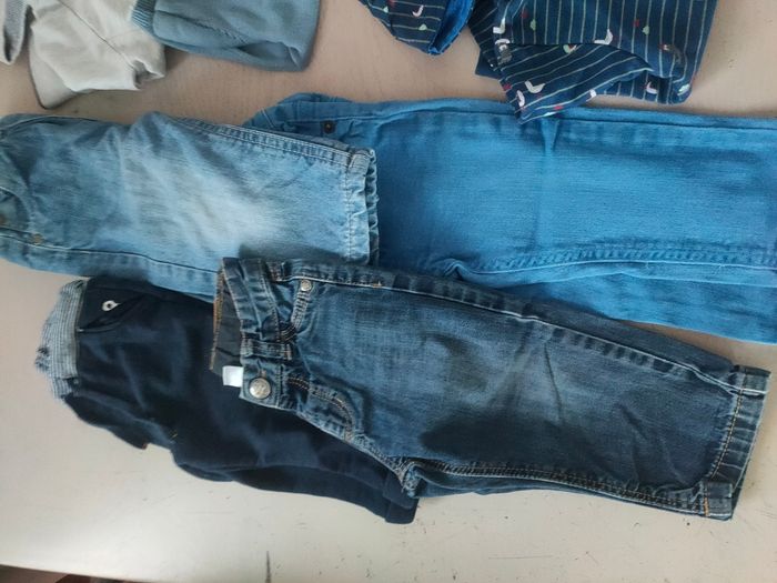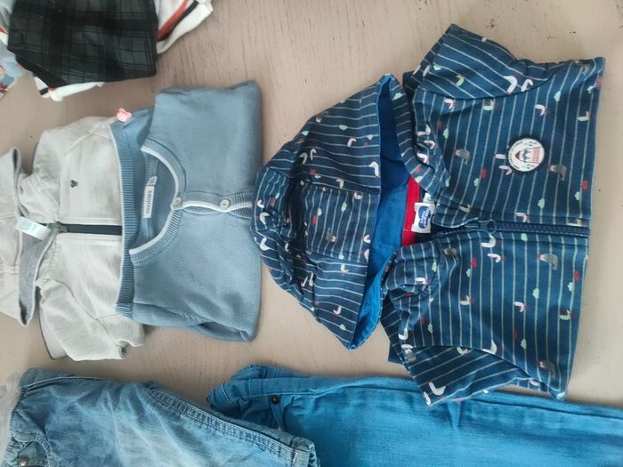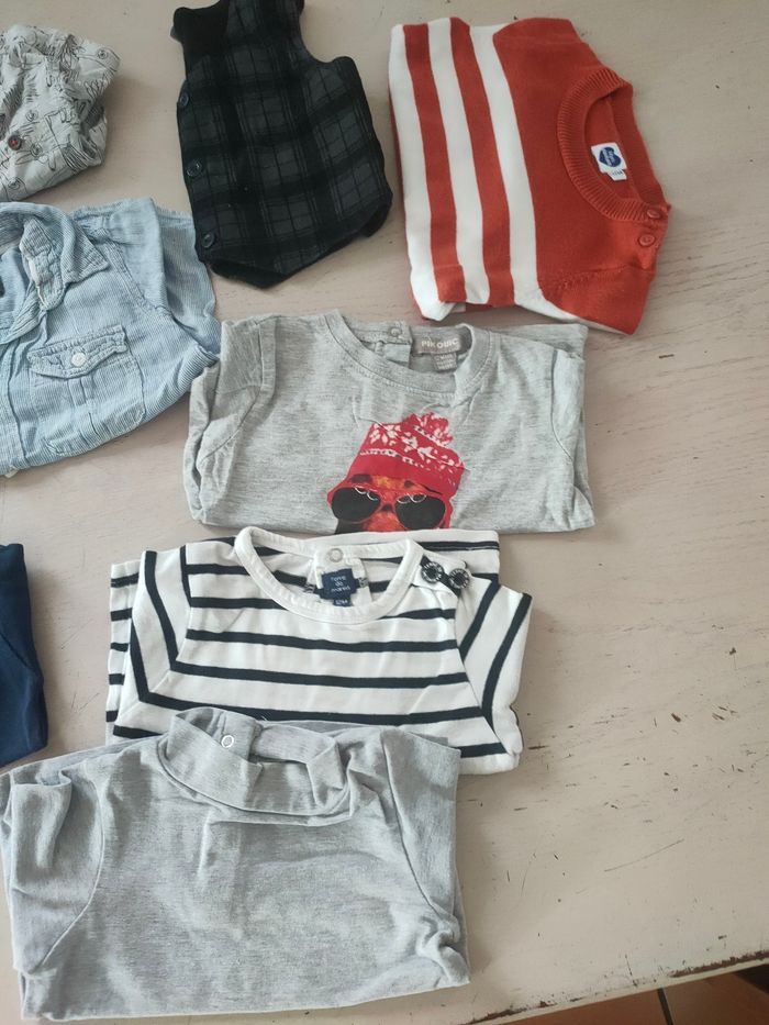 Je propose un lot 12 mois garçon comprenant un pantalon de jogging Obaïbi, un jean baby boy, un de la marque Tex et l'autre de la marque orchestra. Deux pyjama ( tape à l'oeil et Russia) Deux gilets à capuche la mode enfant l'autre Obaïbi. Un gilet sans manche sans marque, un bodie manche longue absorba, une chemise h&M. Un pull mot d'enfants deux t-shirtz manches longues l'un terre de marin un Pic ouic et pour finir un t-shirt manches longues avec petit col montant orchestra.