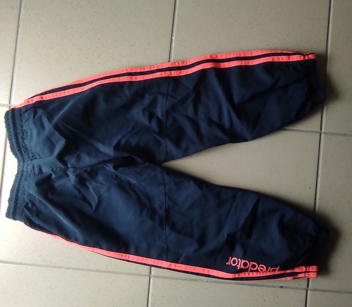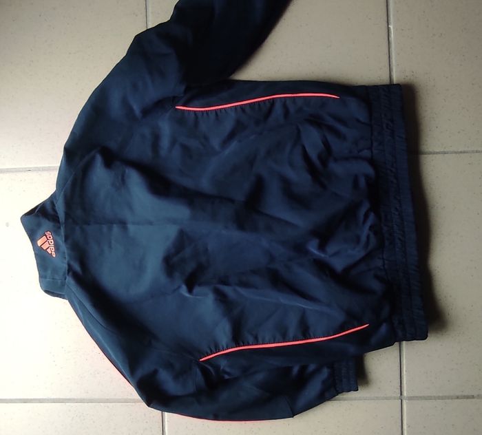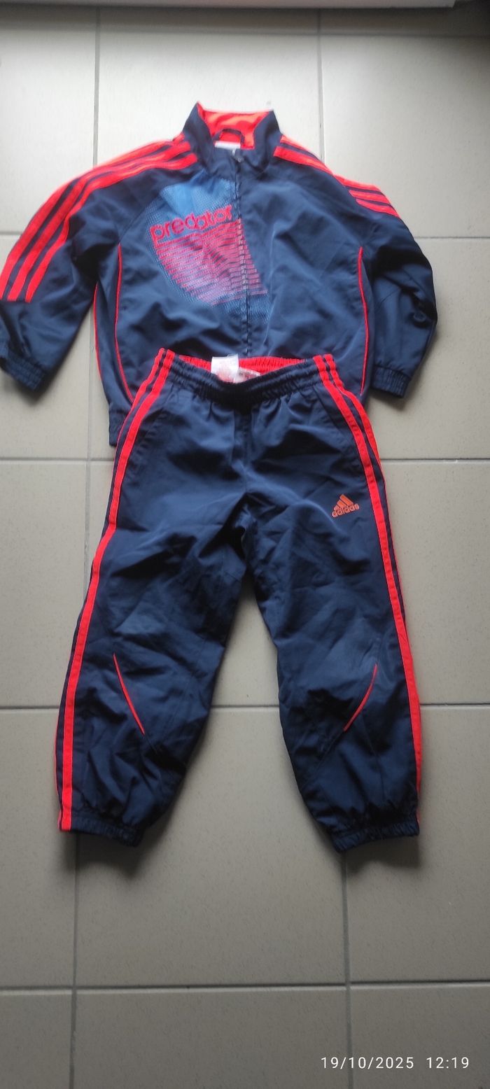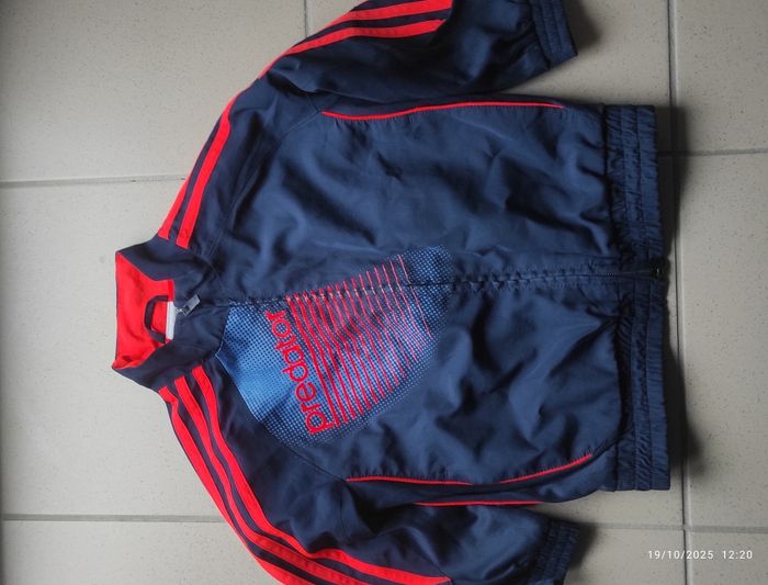 Superbe jogging Adidas Predator bleu marine avec détails rouges. Composé d’une veste zippée et d’un pantalon assorti, il est à la fois léger, confortable et stylé. Idéal pour le sport, les sorties ou un look streetwear rétro 💥