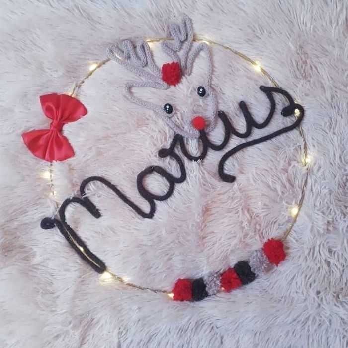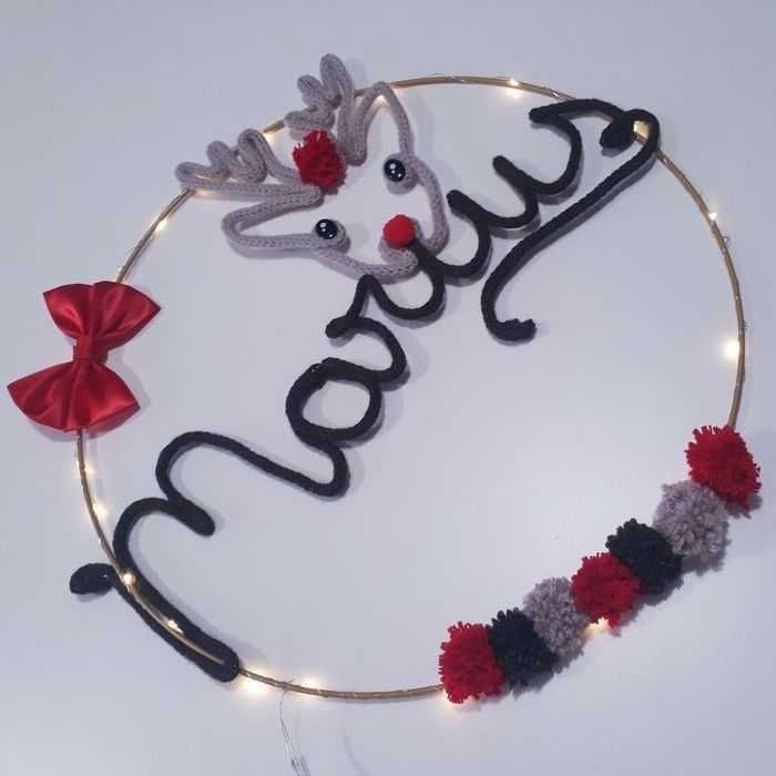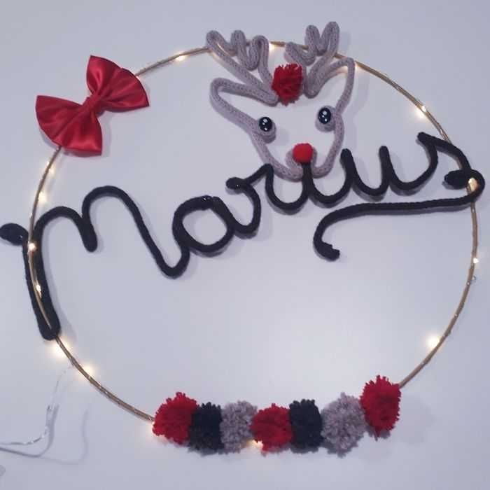 Le prénom en tricotin est un objet de décoration très tendance. Il est fait entièrement à la main avec du fil de coton et du fil de fer. Finitions soignées. Dimensions : environ 45 cm de diamètre. La guirlande lumineuse est fournie avec le tricotin. #tricotin #laine #noël #naissance #bébé #fille #garçon #babyshower #cadeau #occasion #bapteme #mariage #evenement #premature #maternité #brassière #kimono #tricot #crochet #bonnet #turban #béguin #robe #princesse #tutu #tulle #liberty #fleuri #doudou #couverture #plaid #guirlande #ballerine #chausson