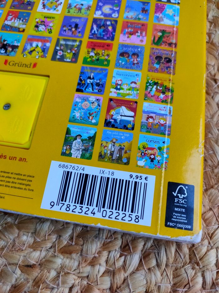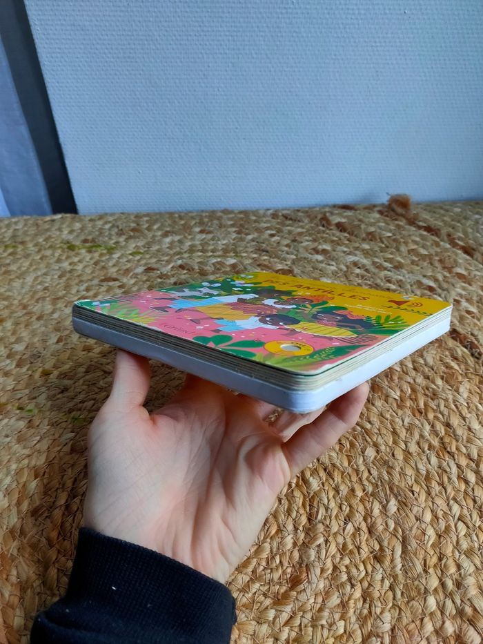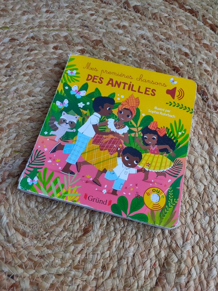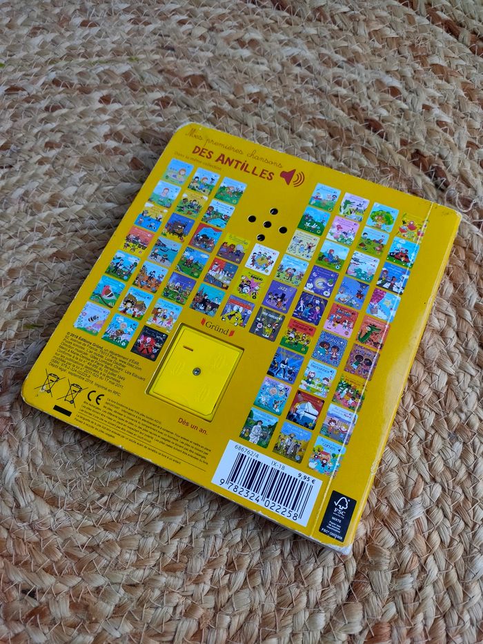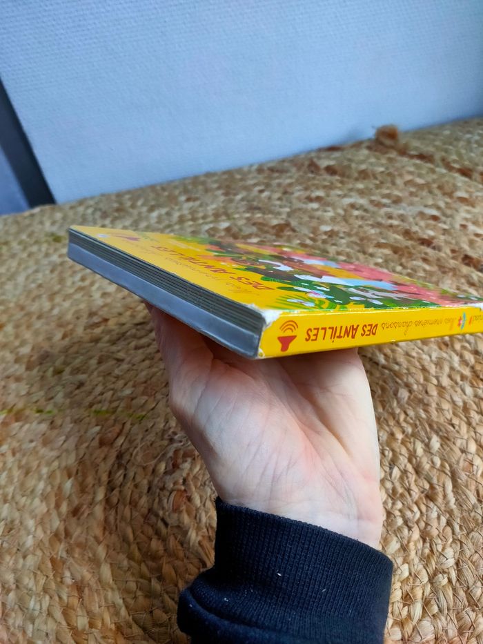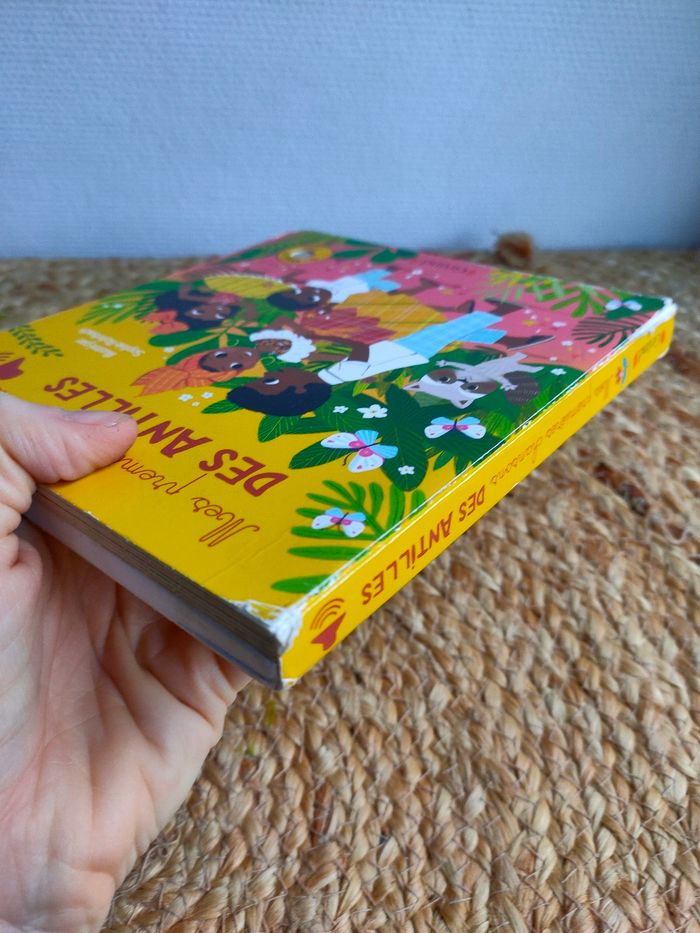 livre sonore "Mes premières chansons des Antilles", en carton, il a été pas mal manipuler il a des traces, les piles sont neuves, elles ont été changé pour la vente, il est donc fonctionnel.
