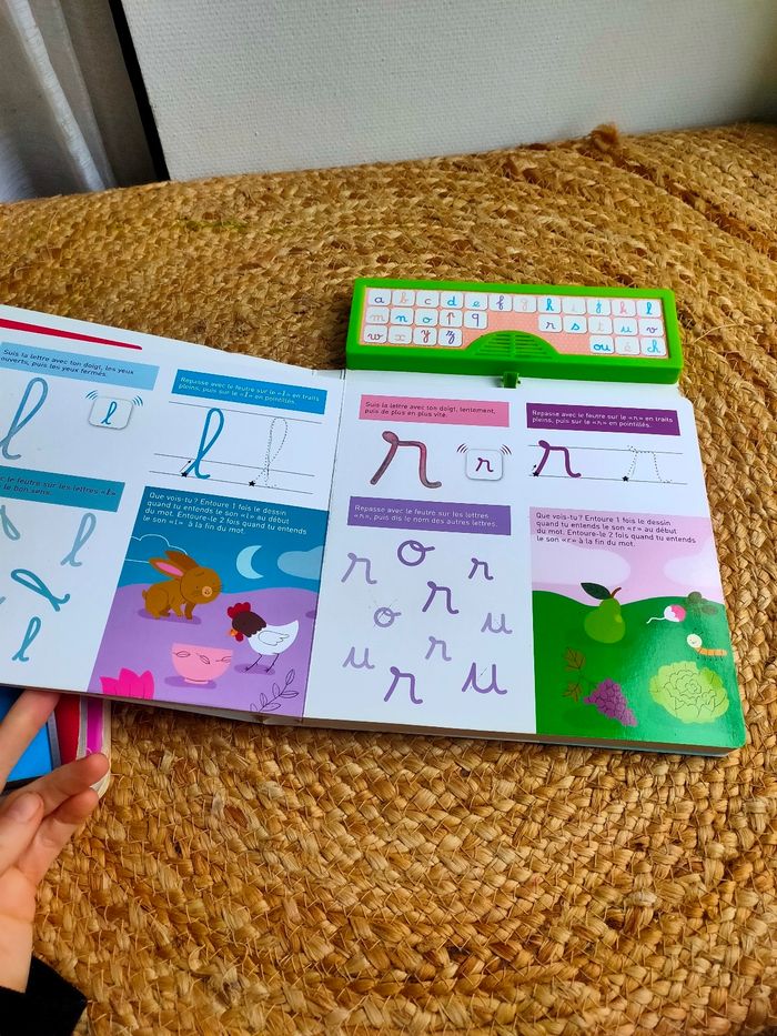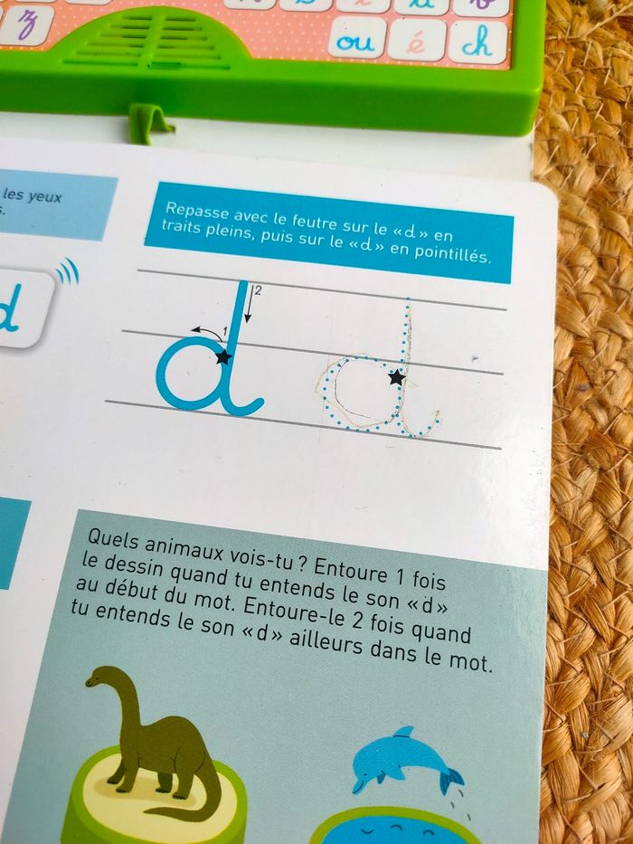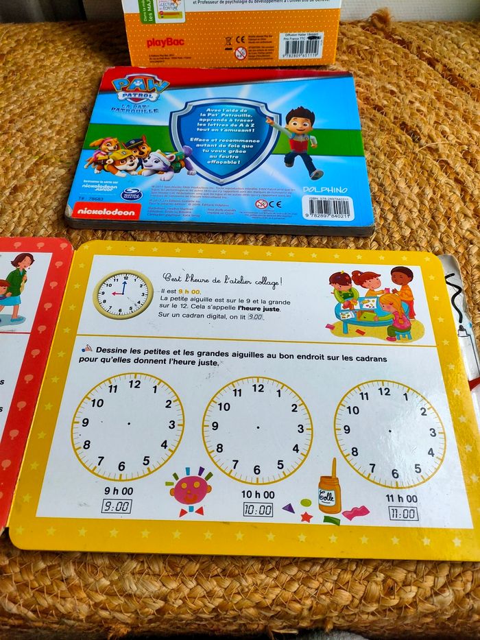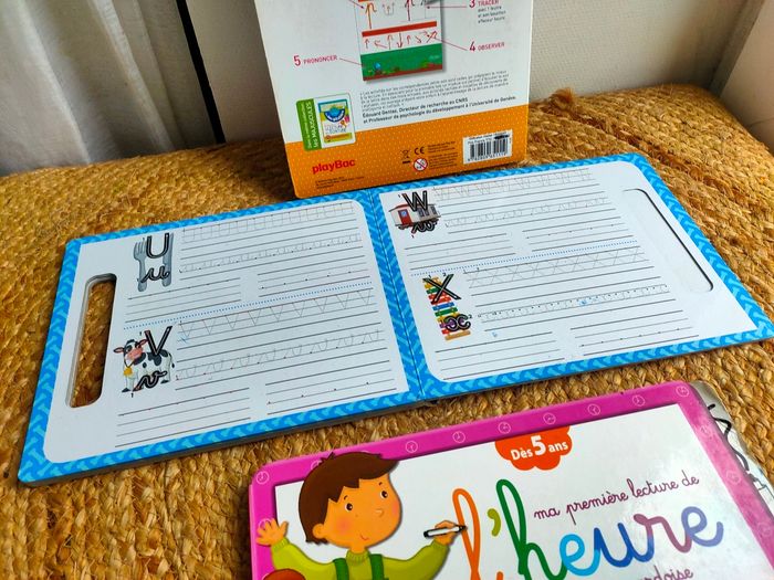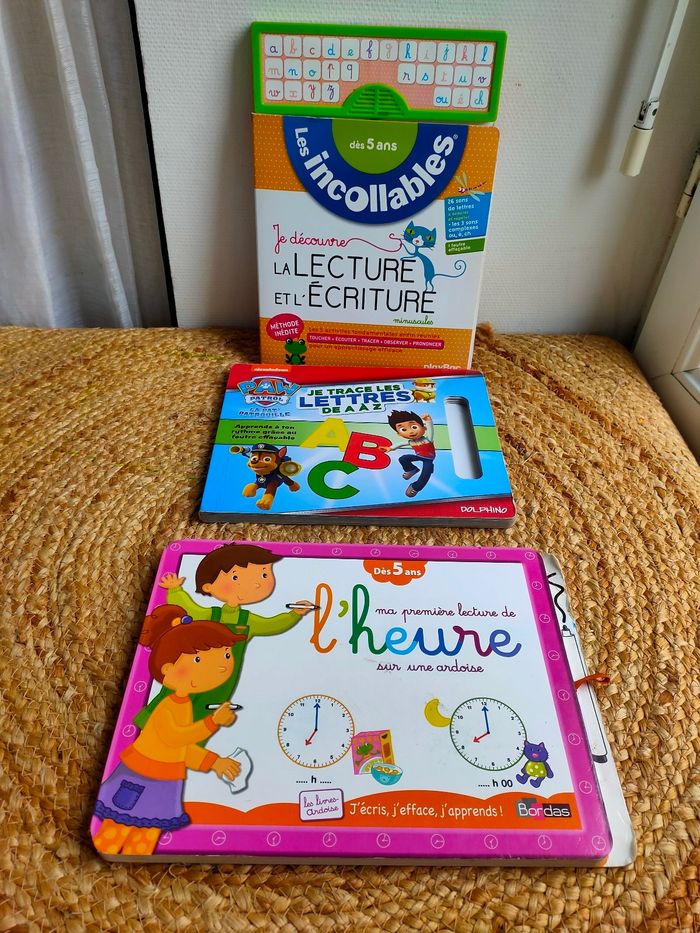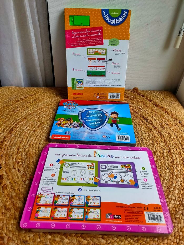 Lot de 3 livres ardoises dont un sonore avec le son des lettres et apprendre a les écrire en attaché, un pat patrouille pour apprendre a tracer les lettres de A à Z en majuscule et minuscule et un livre pour apprendre l'heure. Les livres ont eu beau de succès et ont été utilisé par 2 enfants, ils ont des traces de crayon résistant, le livre sonore fonctionne parfaitement, les piles sont neuves et ont été changé pour la vente.
