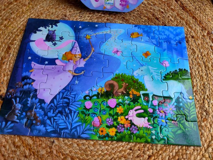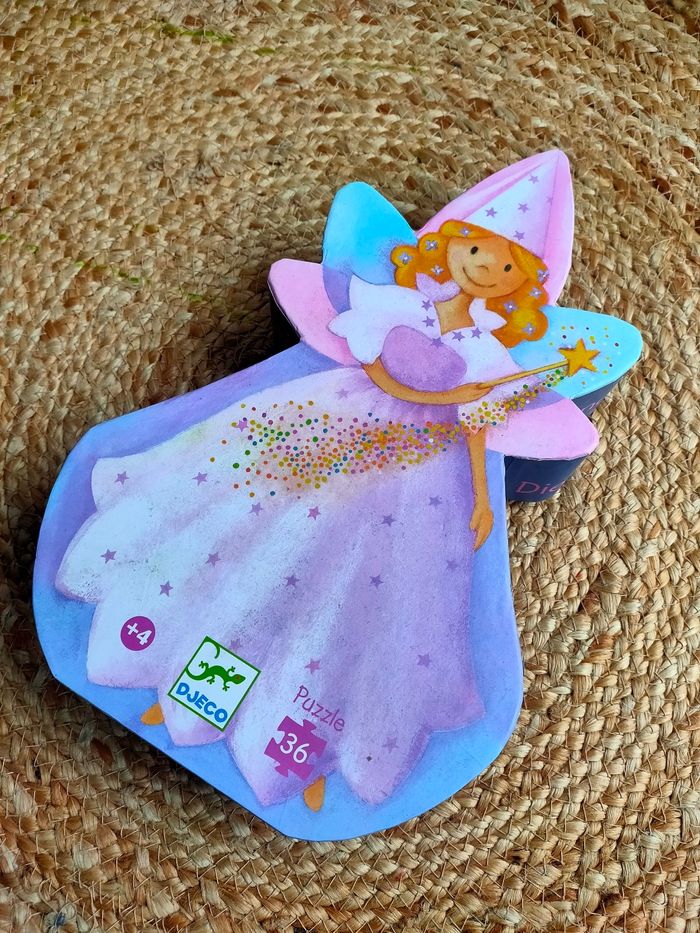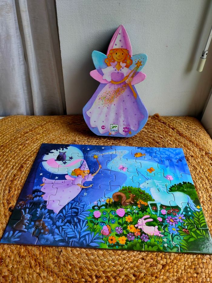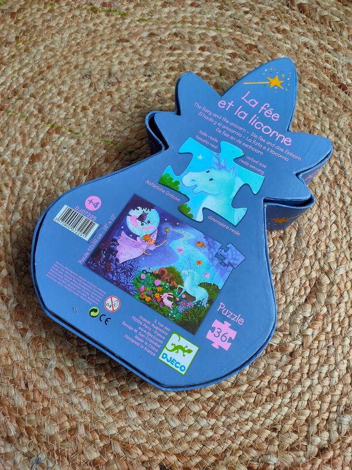 Ce puzzle de 36 pièces représentant une fée et une licorne va plaire aux enfants. Les pièces sont épaisses et solides.Présenté dans une jolie boîte silhouette qui trouvera sa place sur l'étagère pour décorer la chambre de l'enfant.
