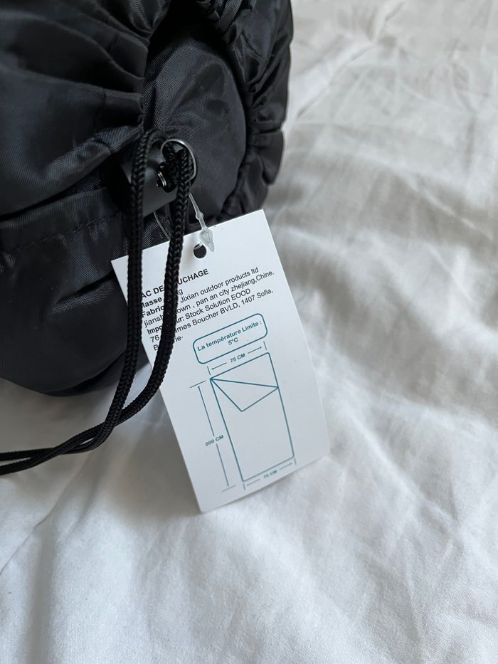 Sac de couchage à capuche, noir avec sac de rangement Dimensions 200 cm de longueur x 75 cm de largeur Jamais utilisé Poids 1 kg Dimensions avec sac de rangement 60 x 38 cm