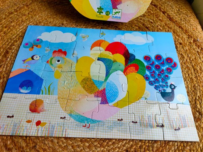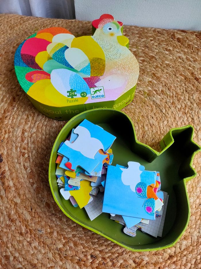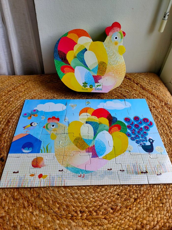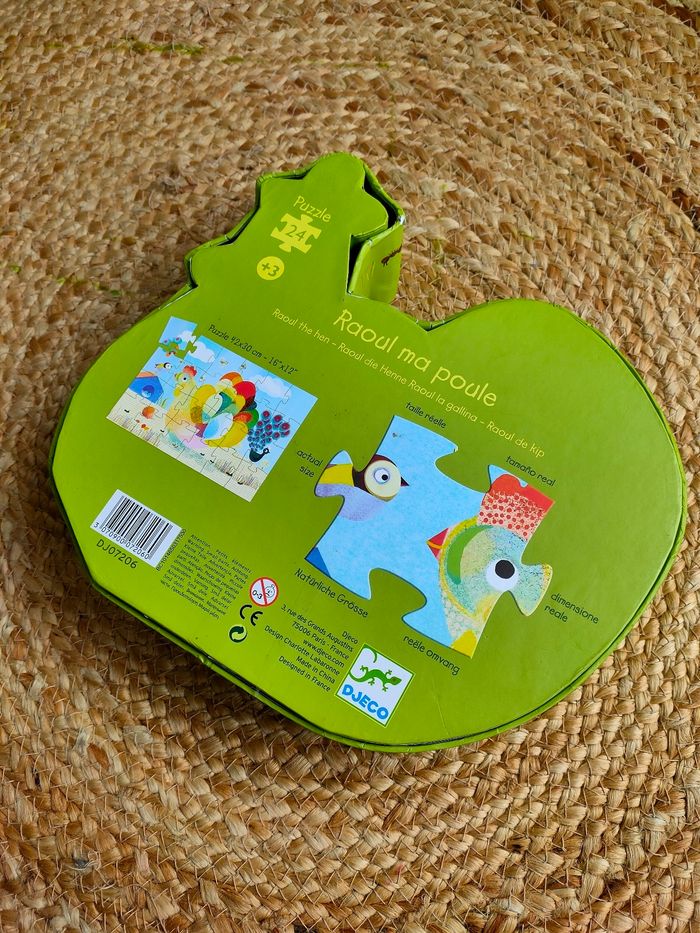 Le puzzle Raoul Ma Poule de Djeco composé de 24 pièces est présenté dans une boîte originale en forme de poule ! Ce puzzle illustre une scène de la ferme avec des oiseaux, un paon et la poule au ramage des plus coloré. Il a été manipulé, il est en bon état Dimensions : 42 x 30 cm Âge : a partir de 4 ans Prix ferme, PAS DE NÉGO !!!