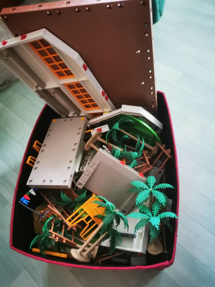 Je vends cette caisse de Playmobil divers avec plaques, forêt....