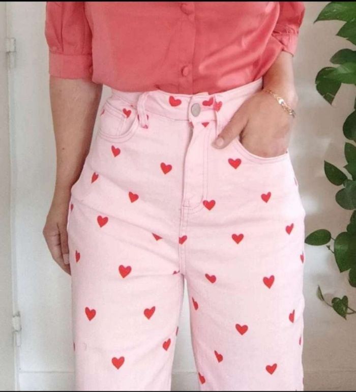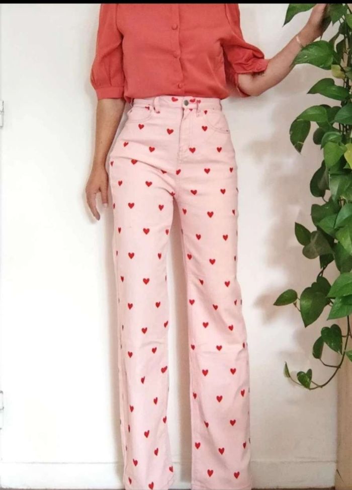 Pantalon rose à cœur rouge Jean taille haute jambes large cintrée original automne-hiver confortable