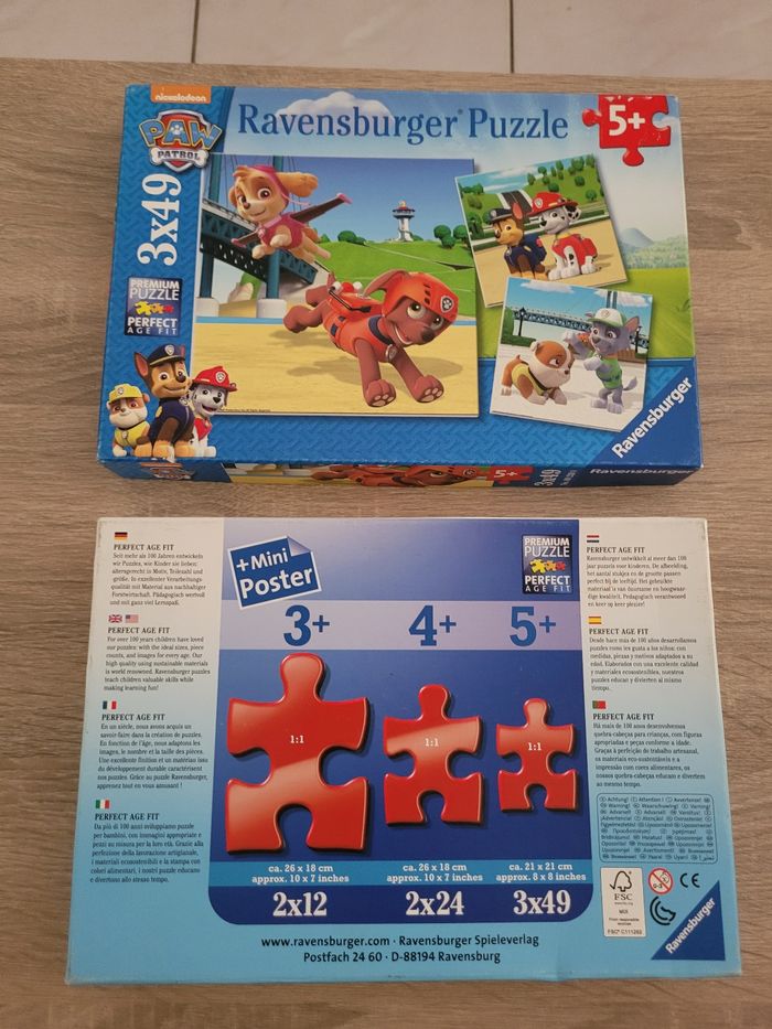 Vend lot de 3 puzzles de 49 pièces avec les posters de la Pat patrouille en très bon état juste des signes d'usures liés au stockage sur la boîte d'origine (voir photos). À partir de 5 ans. Vendu tel que sur la publication.