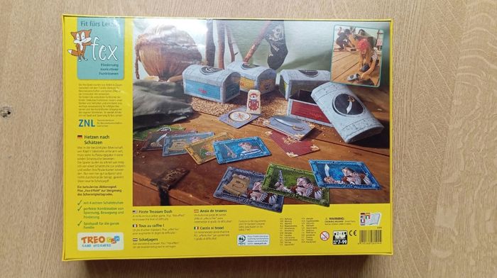 Neuf Recherche le trésor du pirate Dans Hetzen nach Schätzen, si les joueurs veulent être embauchés par le capitaine, ils devront lui prouver combien ils sont intelligents et se joindre à lui sur une chasse au trésor. Ils ont besoin de courir aussi vite que possible d'un coffre au trésor à l'autre pour se débarrasser de leurs cartes de pirates. Celui qui s'est défait de l'ensemble de ses cartes de pirates dans les coffres au trésor correctement et qui ramasse le pion au centre de la table se trouvant sur la carte "boussole" aura toutes ses chances de remporter cette chasse au trésor au rythme effrénée !