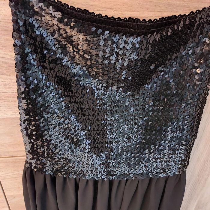 Robe bustier noire avec strass , très bon état , marque LM, polyester, longueur 83 cm largeur bustier 30 cm T40