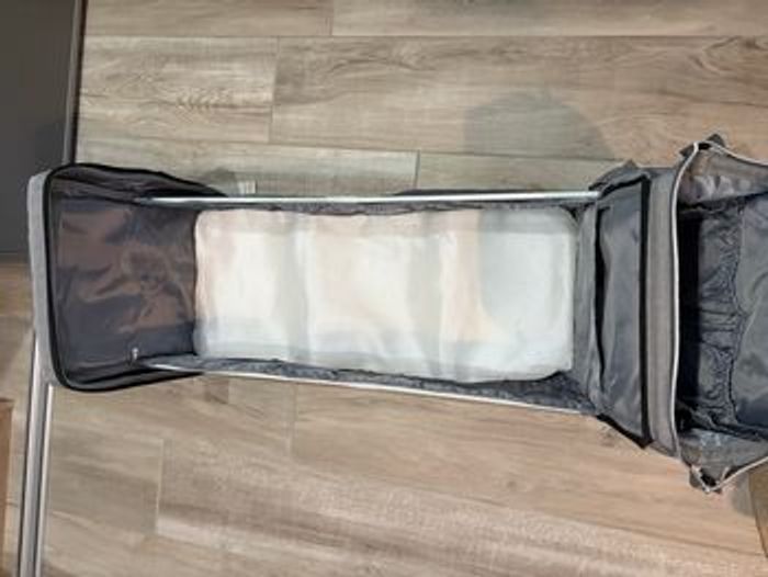 Comme neuf, jamais utilisé (cause doublon) Fonctionnalités : Nombreux compartiments, poche isotherme, port usb, peut se transformer en lit une fois ouvert totalement, avec petit matelas et moustiquaire intégrée.