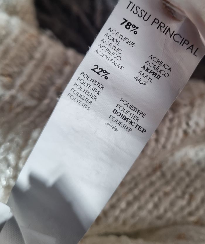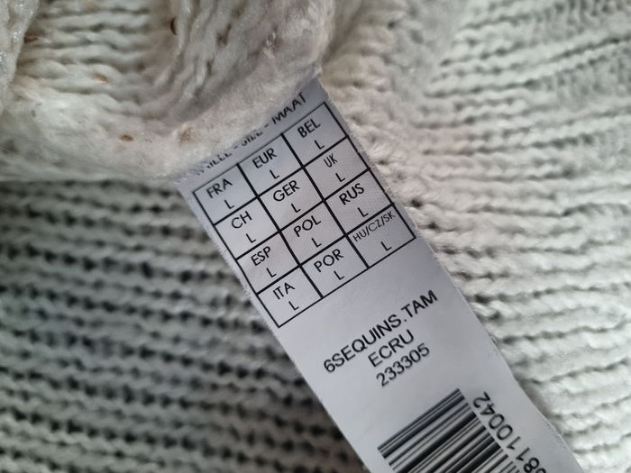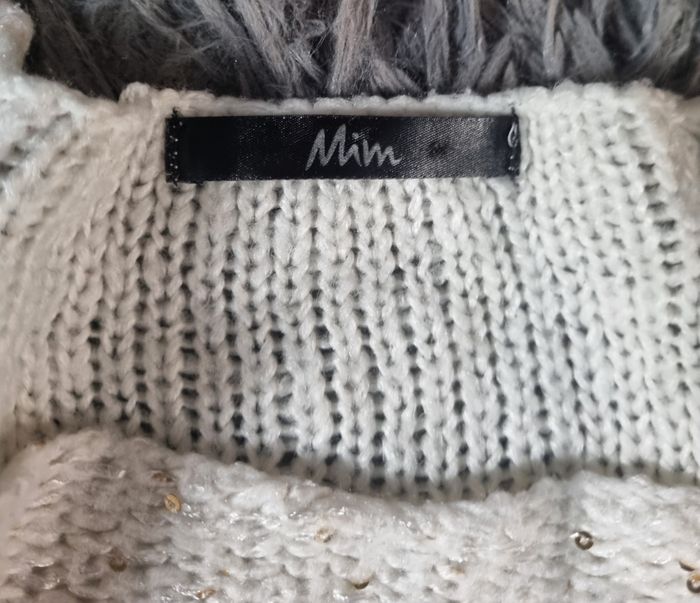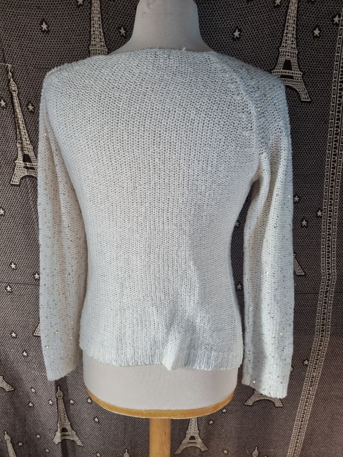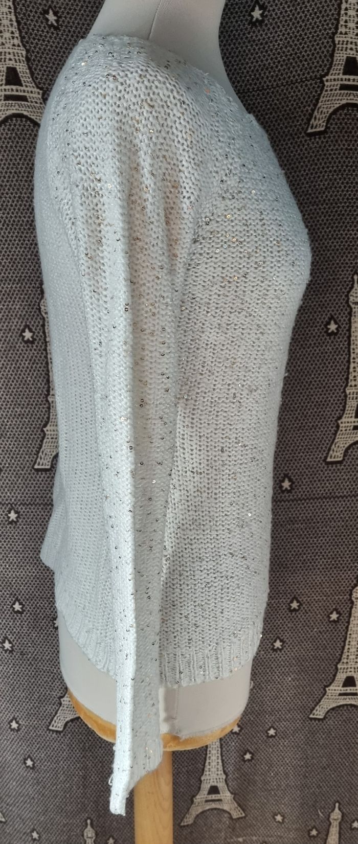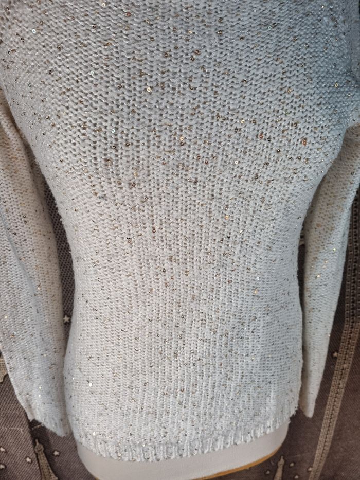 Pull couleur écru avec sequins doré, taille L marque Mim,longueur 60cm, largeur 46cm, longueur épaule à aisselle 22cm, largeur aisselle à aisselle 44cm, longueur manche 48cm.