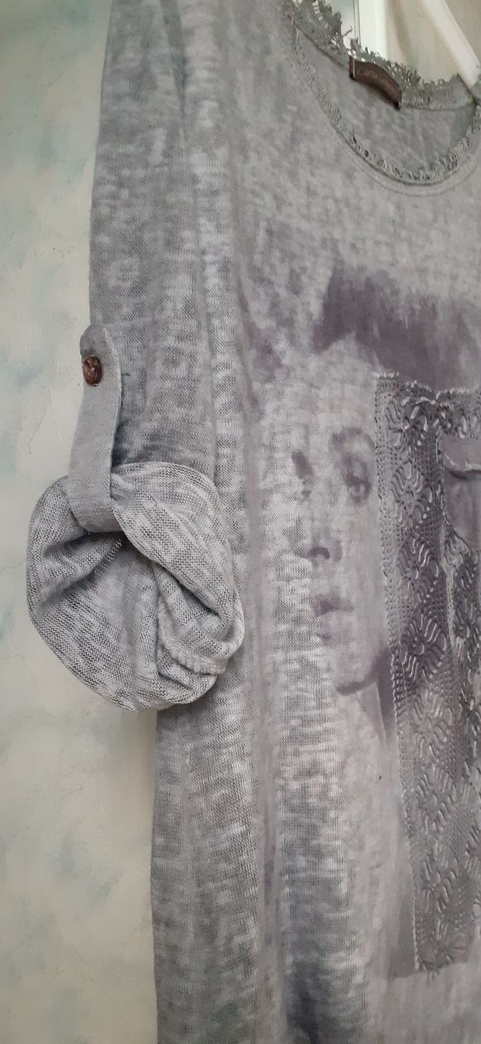 Vends une tunique en maille fine 100 % polyester, manches longues qui peuvent se retourner, dentelle et petite poche devant, couleur gris, marque Carla Giannini, taille 38-40. Longueur de l'épaule à la base : 78 cm Largeur aisselle à aisselle et hanches : 48 cm.