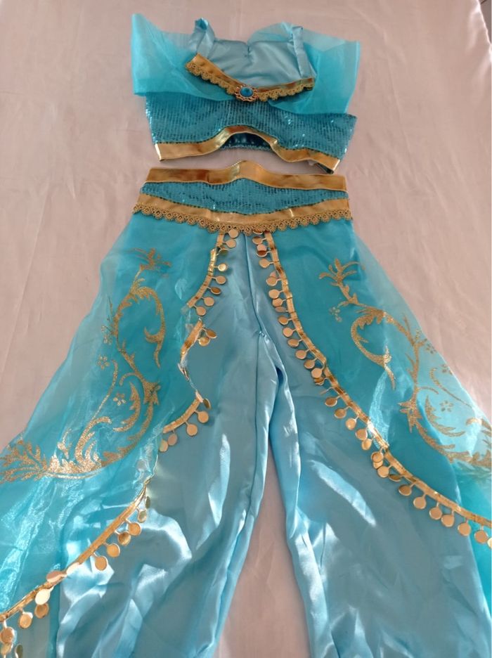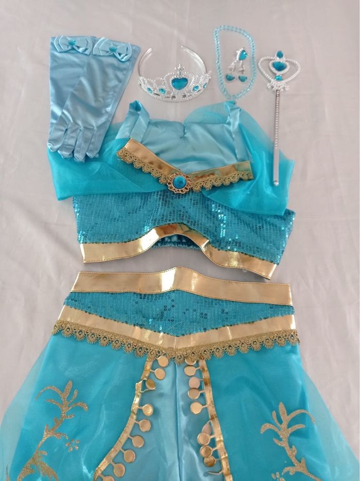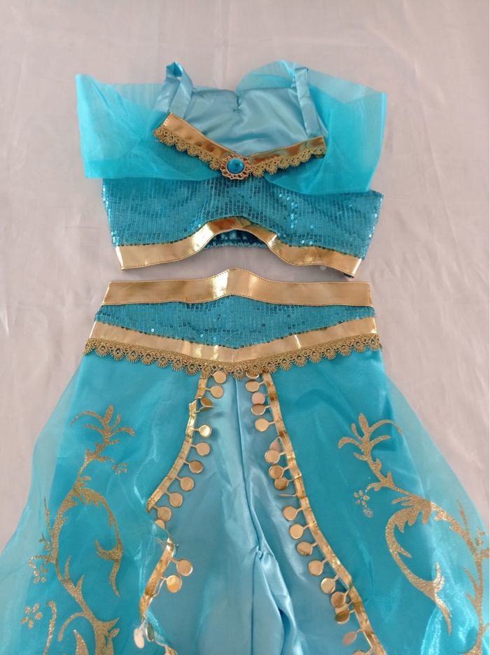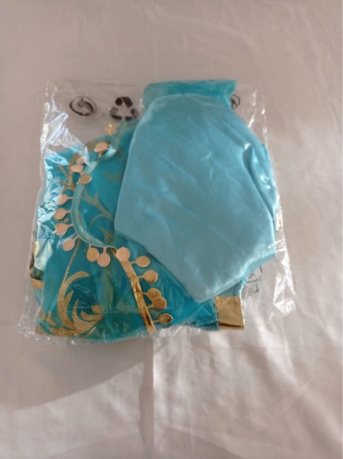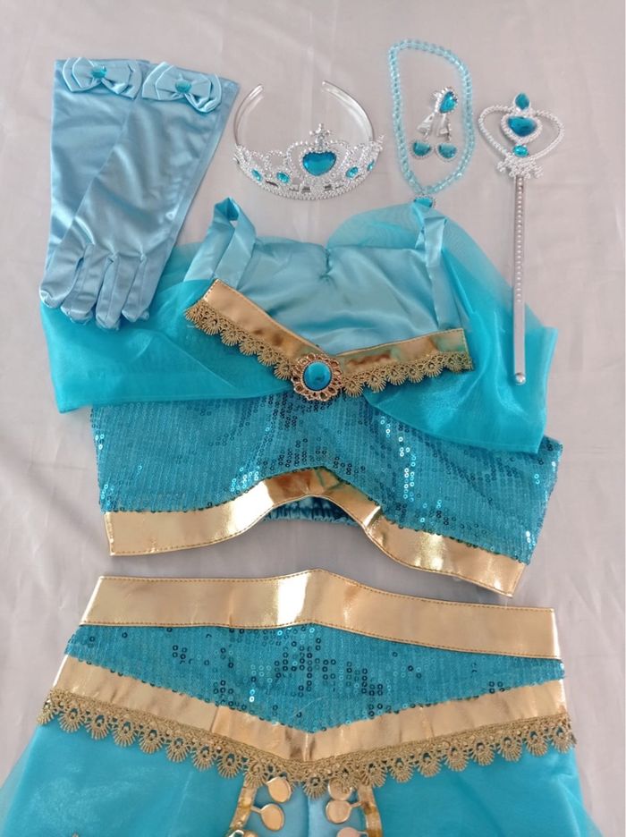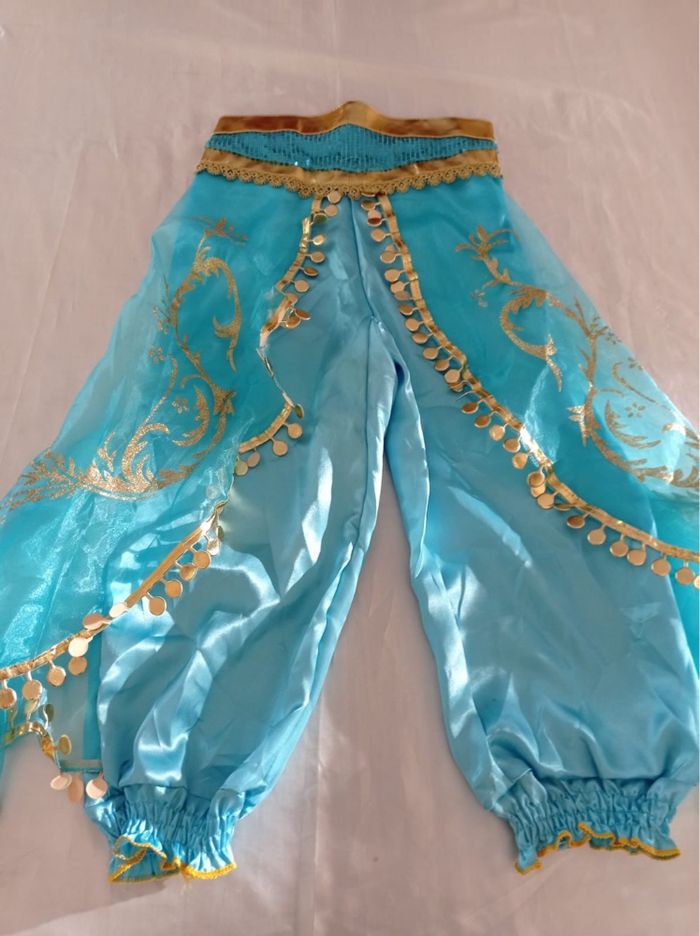 Déguisement princesse Jasmine pantalon et ces accessoires (gants, baguette, couronne, bijoux). La top mesure 25cm de longueur et le pantalon mesure 65cm de longueur. La taille convient aux petites filles de 6ans. Totalement neuve, vendue dans son emballage d’origine. Expédition rapide après votre commande