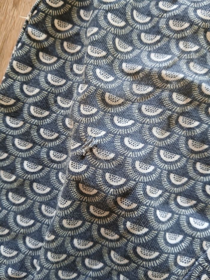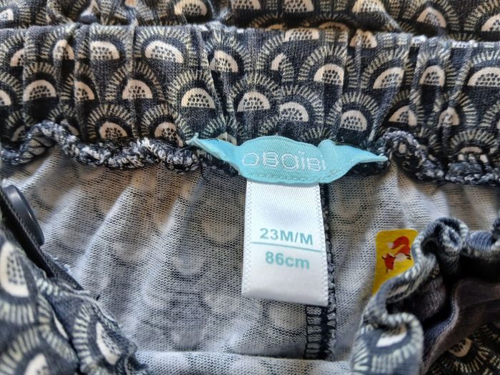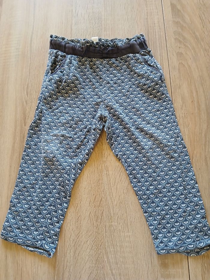 Pantalon léger bleu a motifs de coquilles de la marque Obaibi. Taille 23 mois / 86 cm Bon état, mais un debut de trou au genou