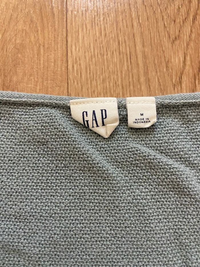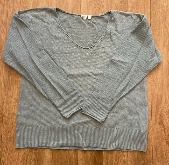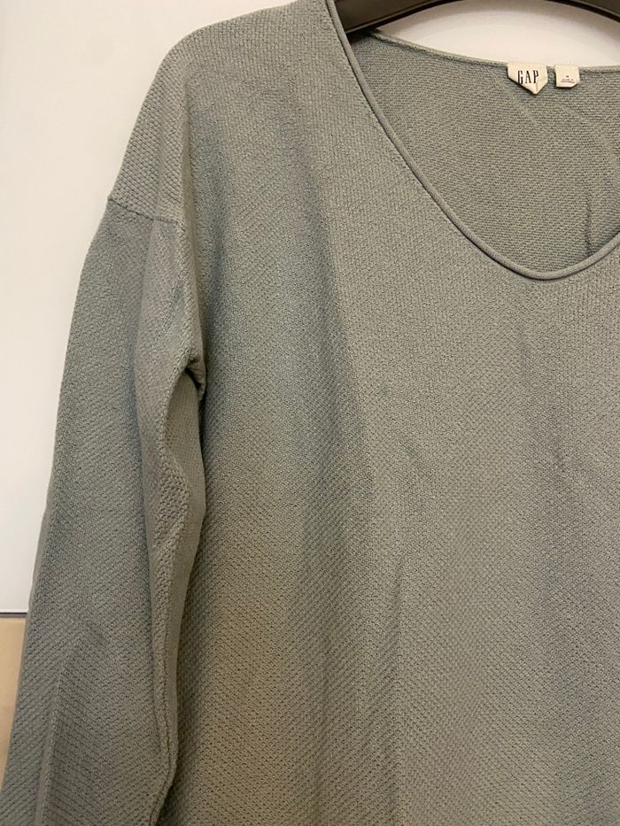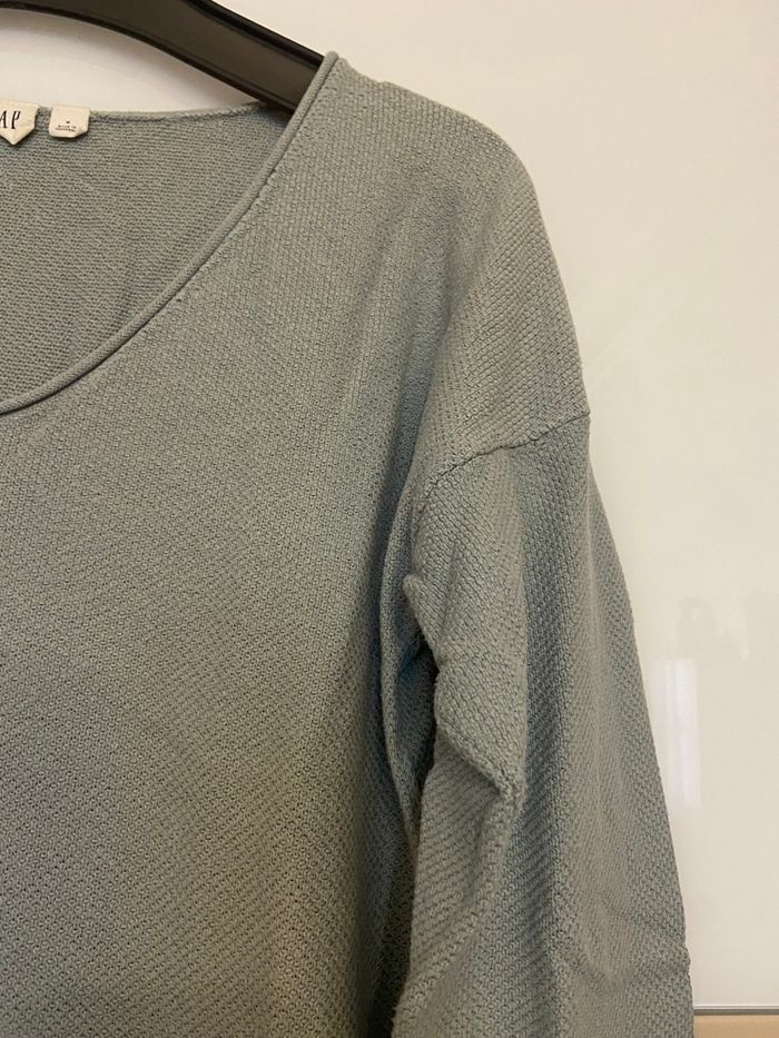 pull col V en maille légère de couleur vert clair de la marque Gap. Taille : 38 - M Couleur : Vert Matière : Maille légère coton Caractéristiques : Col V Longueur 60 cm