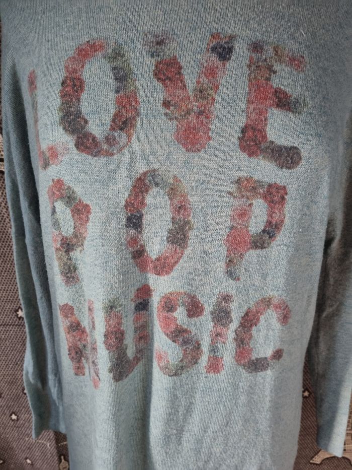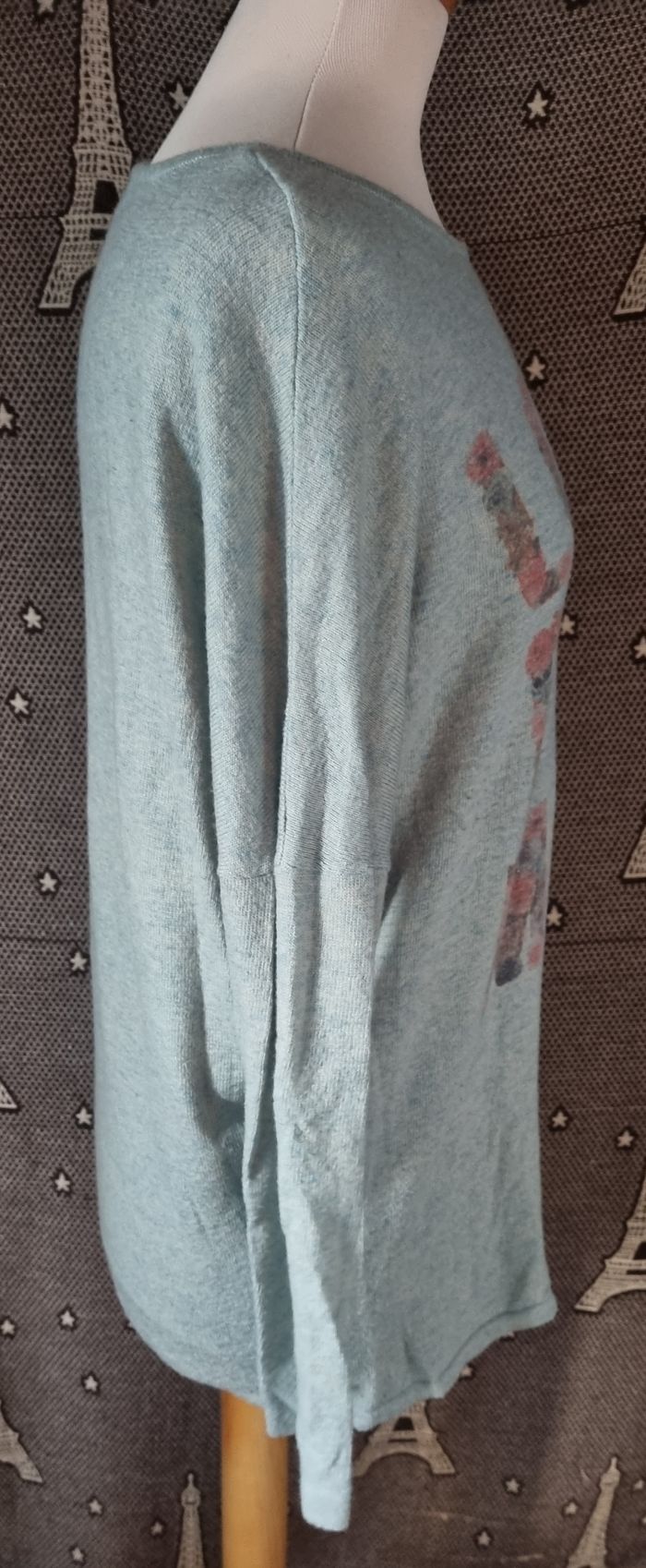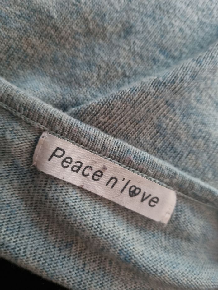 Pull avec écriture, taille 44-46 marque Peace N'Love,longueur 67cm, largeur 50cm ,longueur épaule à aisselle 23cm ,largeur aisselle à aisselle 62cm, longueur manche 34cm.