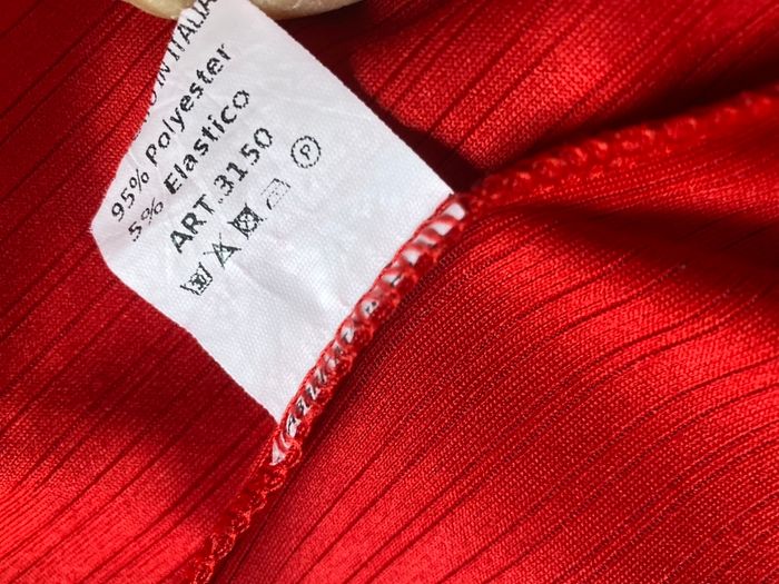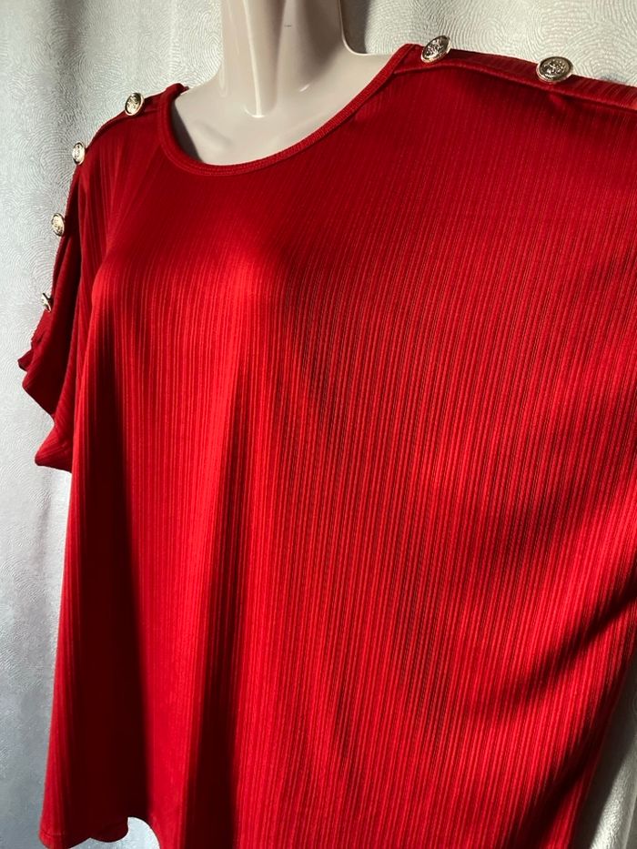 Tunique rouge taille unique boutons dorés aux épaules 95 % polyester 5% elasthane Envergure totale 80 cm Aisselle à aisselle 69 cm Largeur à plat en bas sans tirer 70 cm Longueur 66,5 cm