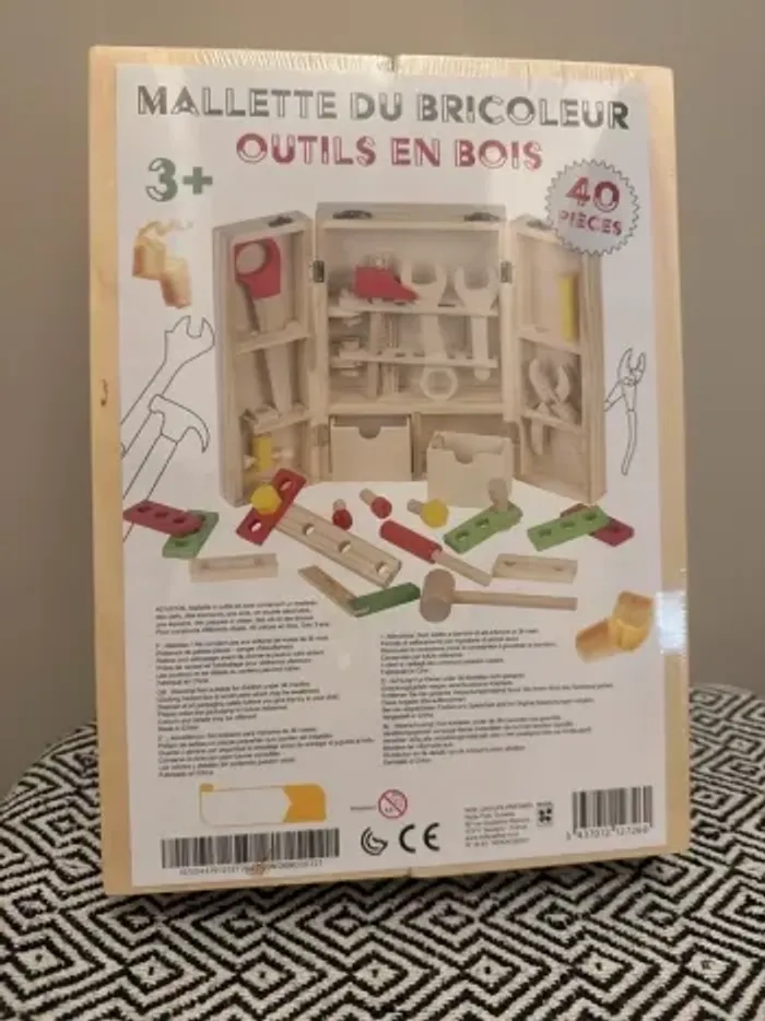 Vendeur professionnel Mallette à outils en bois contenant 40 pièces : un marteau, des clefs, des tournevis, une scie, un double décimètre, une équerre, des plaques à visser, des vis et des écrous. Dim : 20 x 30 x 8 cm. Référence 3437012127260 À partir de 3 ans Expédition rapide