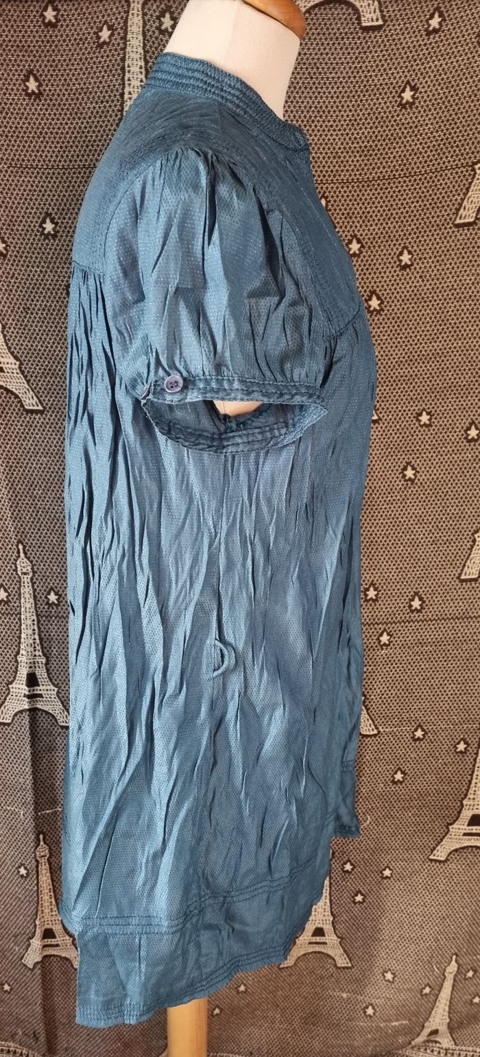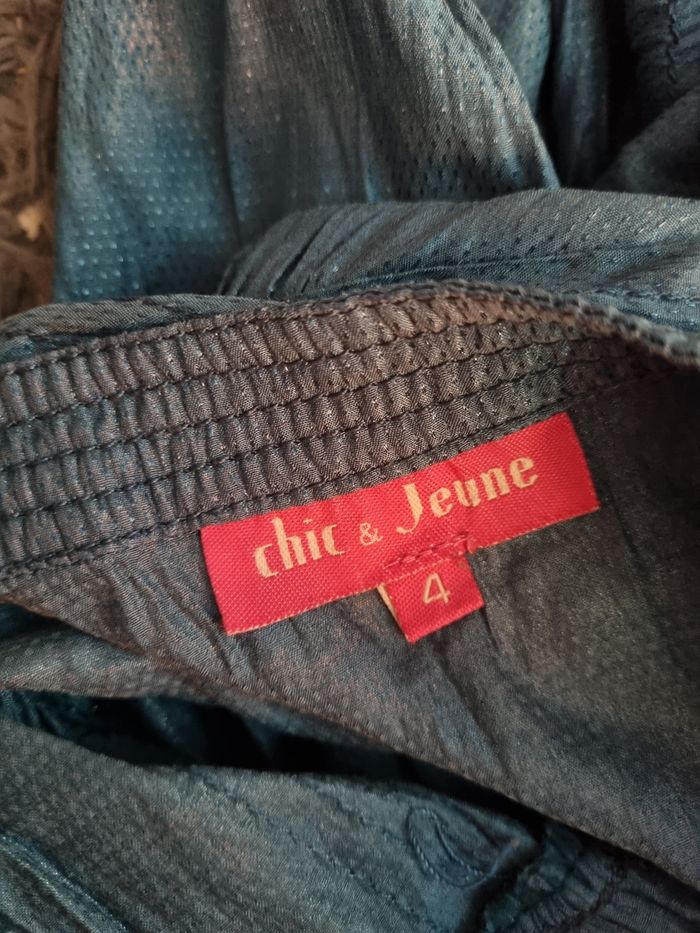 Tunique bleu pailleté, manches courtes, taille 42-44 marque Chic & Jeune,longueur 79cm, largeur 58cm, longueur épaule à aisselle 22cm, largeur aisselle à aisselle 51cm.