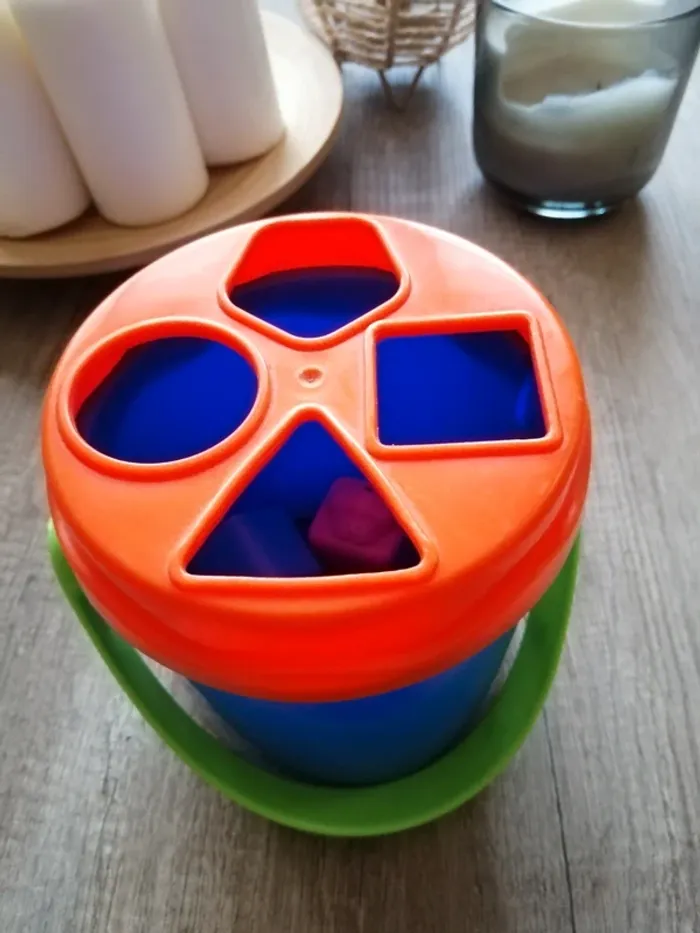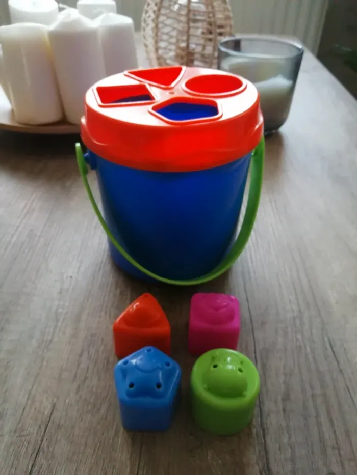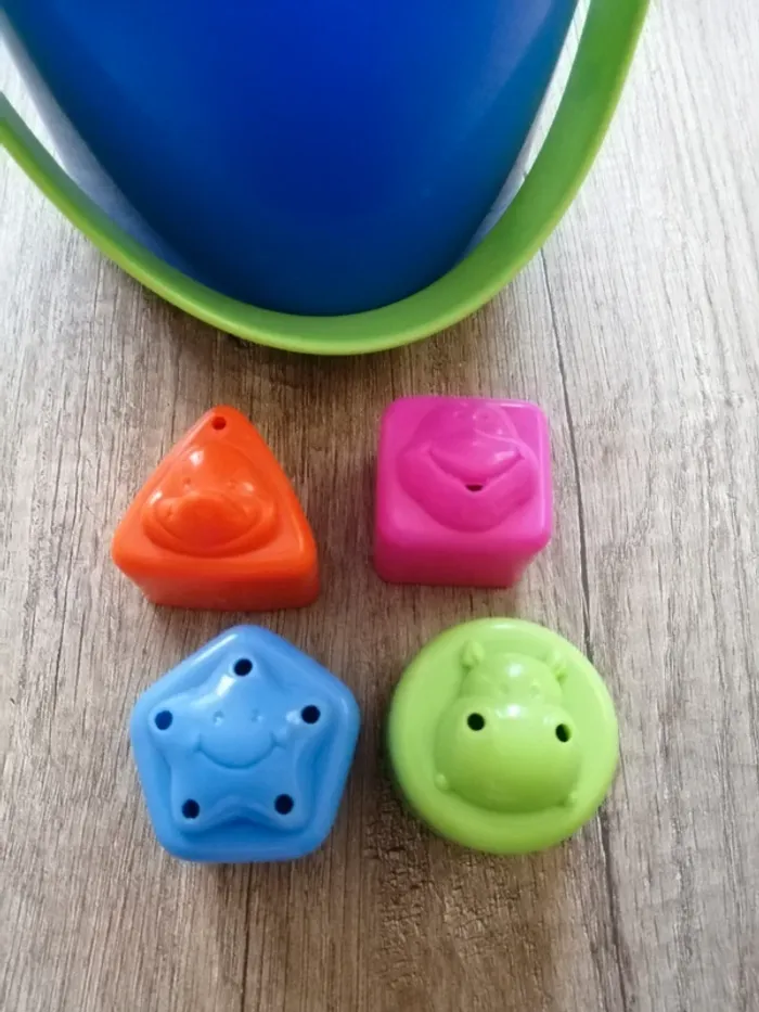 Jouets bébé "seau à formes" Avec 4 petites formes tête d'animaux : Le cercle : l'hippopotame L'étoile : Le canard Le carré : la grenouille Le losange : l'étoile
