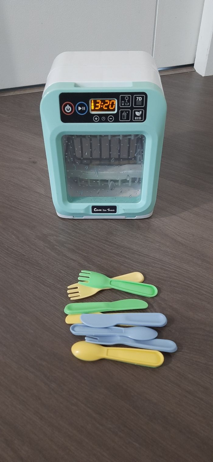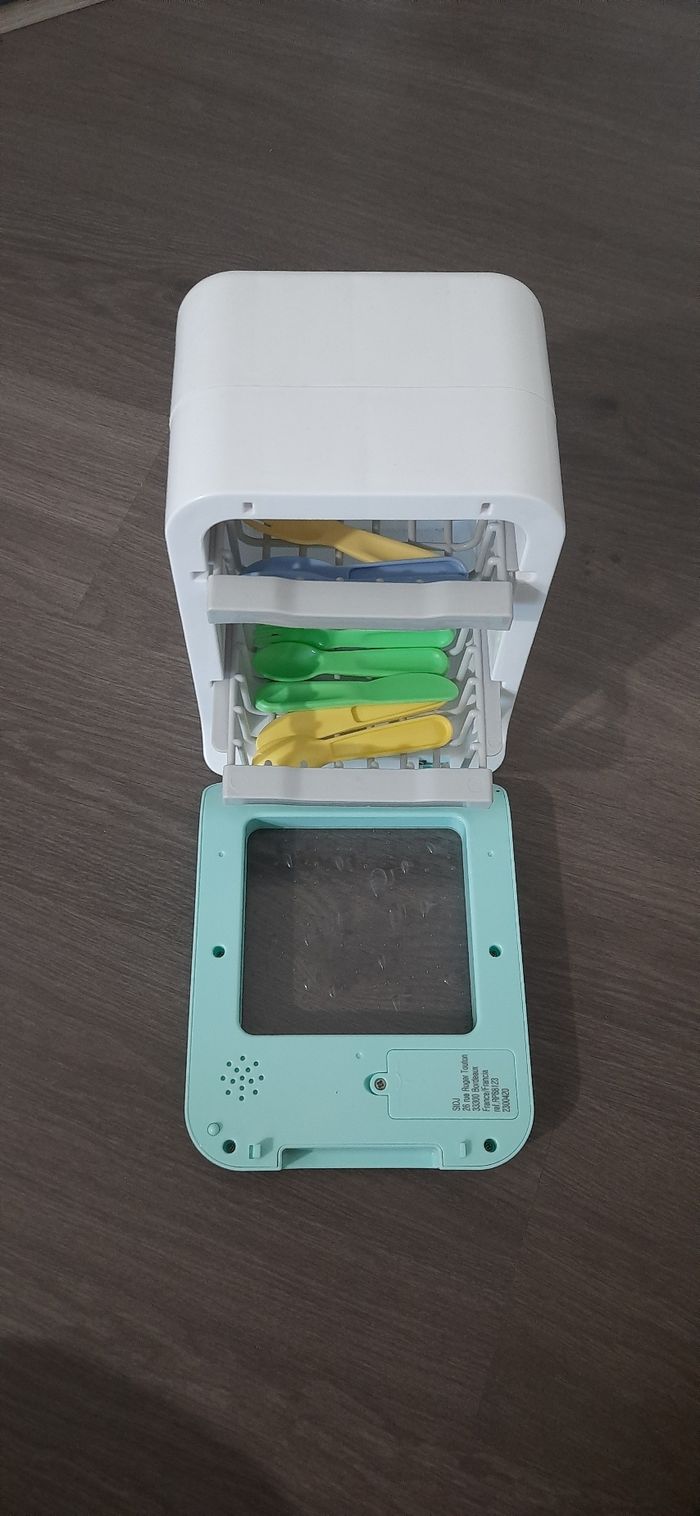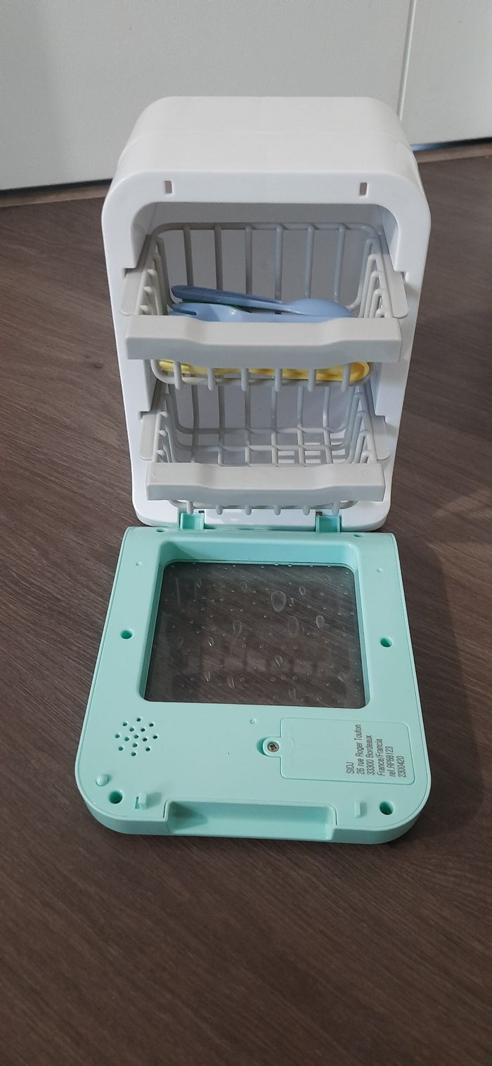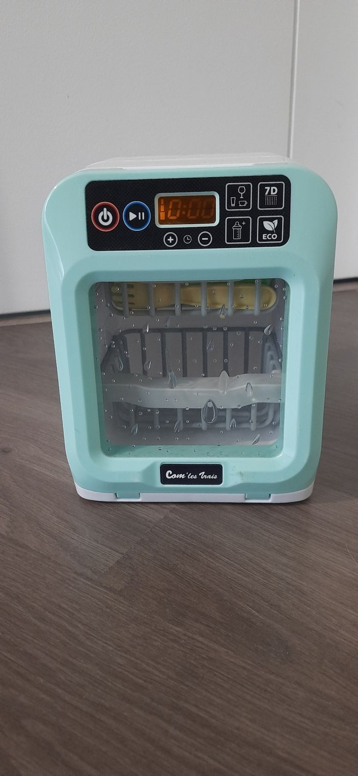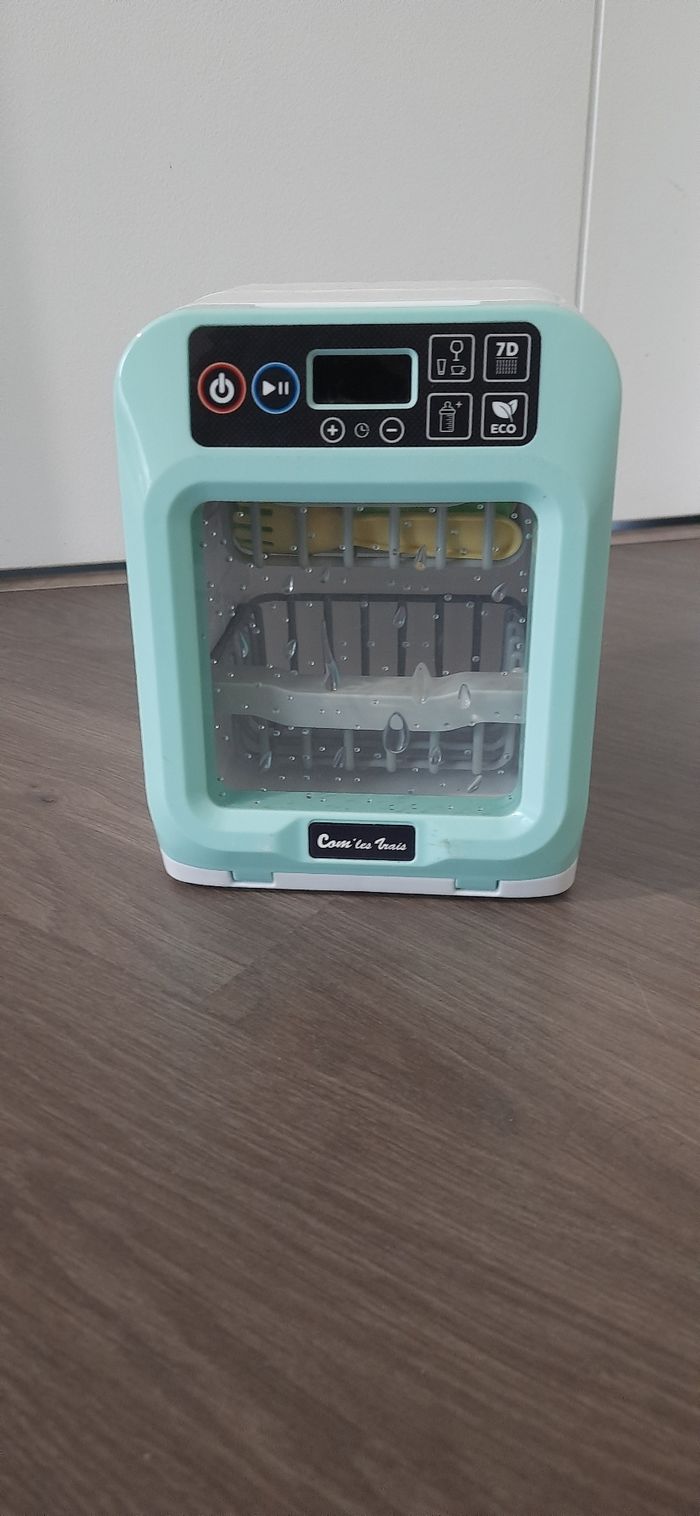 Lave-vaisselle avec accessoires. Effets sonores et lumineux. Boutons : 4 différents programmes de lavage, boutons pour ajuster le temps. La porte s'ouvre et les paniers sont amovibles pour récupérer la vaisselle. En très bon état, fonctionne parfaitement.