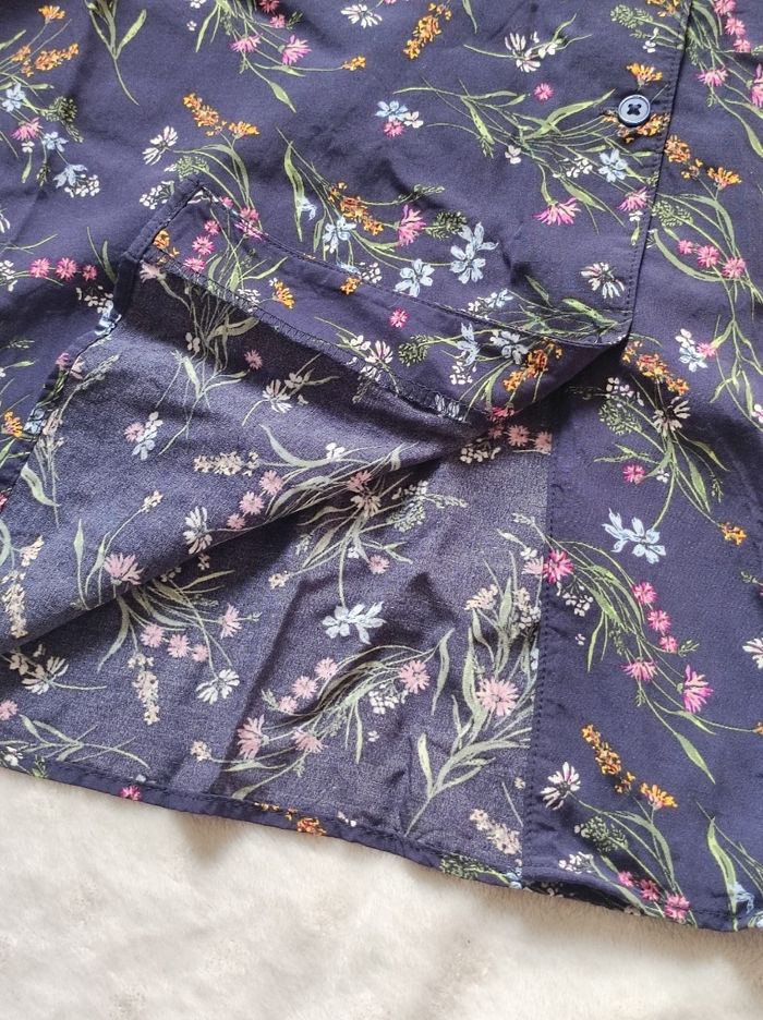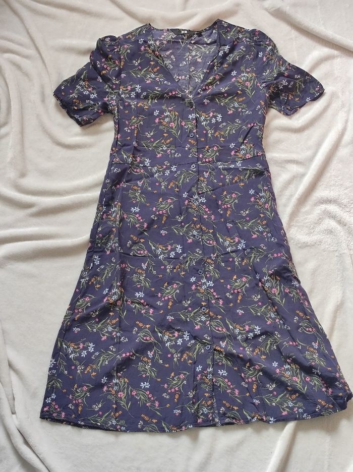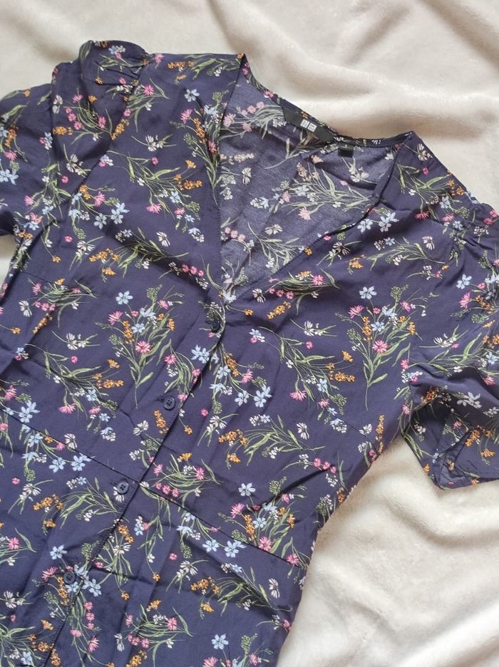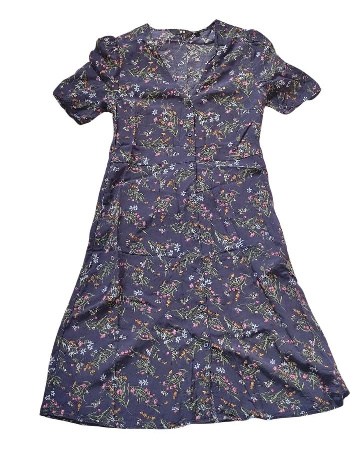 magnifique robe midi imprimé fleurie à manches courtes et col en V. Boutonner tout le long à l'avant. Légère et fluide, très agréable à porter. Petite fleurs colorées sur fond bleu marine. 100% viscose. Marque uniqlo en taille 36 / S. En parfait état ni trous tâches ou déchirures.