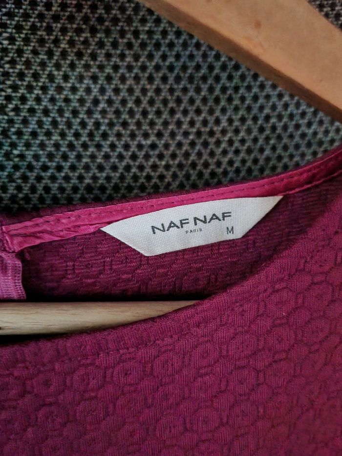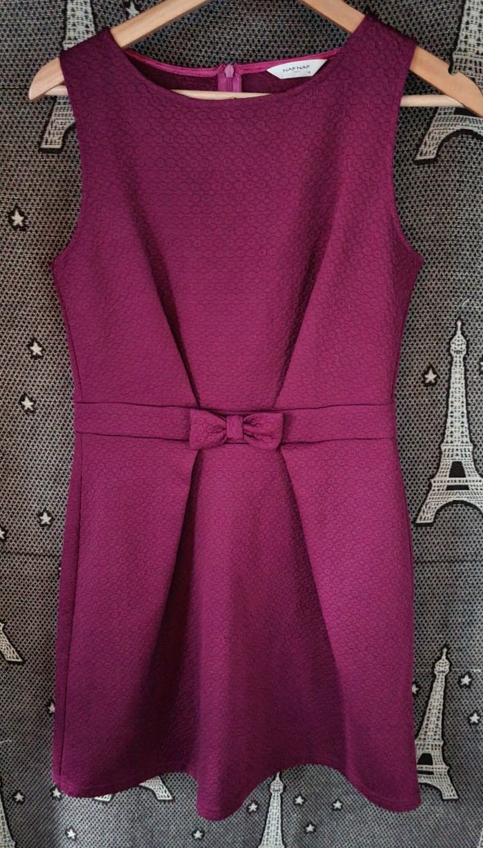 Robe violette avec nœud papillon, taille M marque Naf Naf, peu porté, longueur 86cm, largeur 36cm, longueur épaule à aisselle 20cm, largeur aisselle à aisselle 44cm, largeur épaule à épaule 34cm.