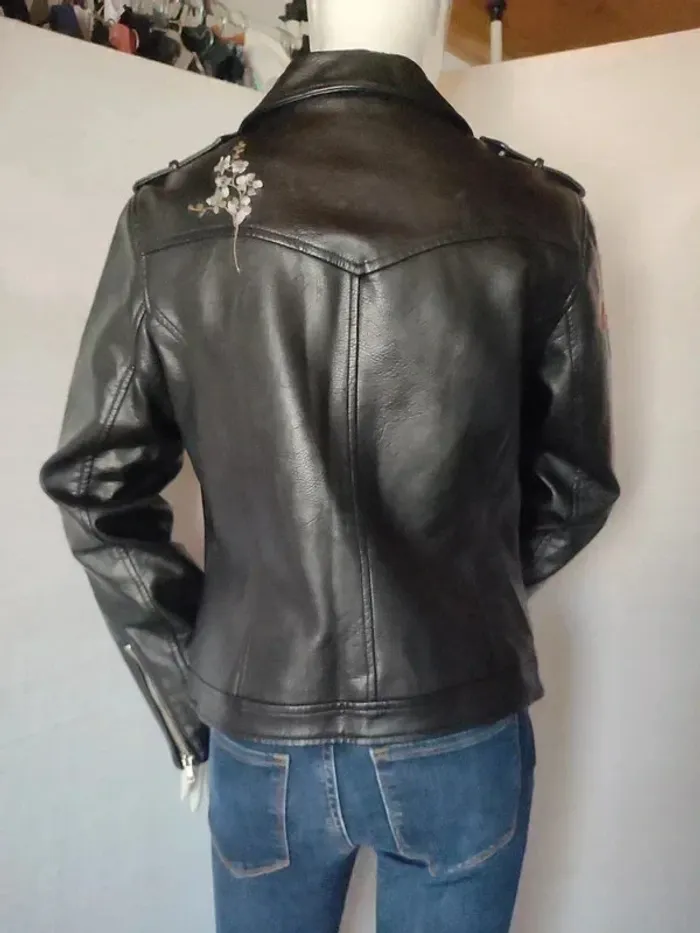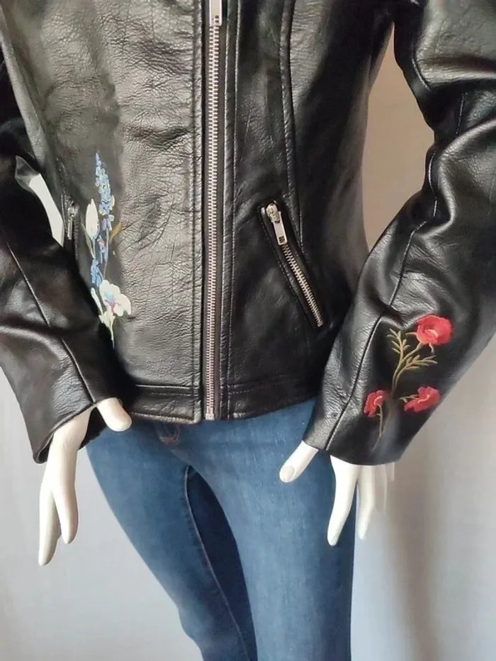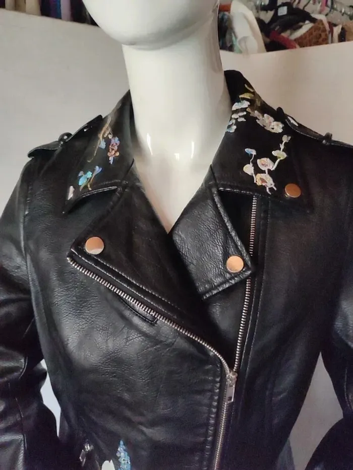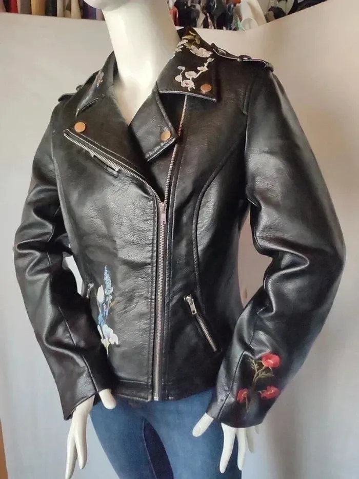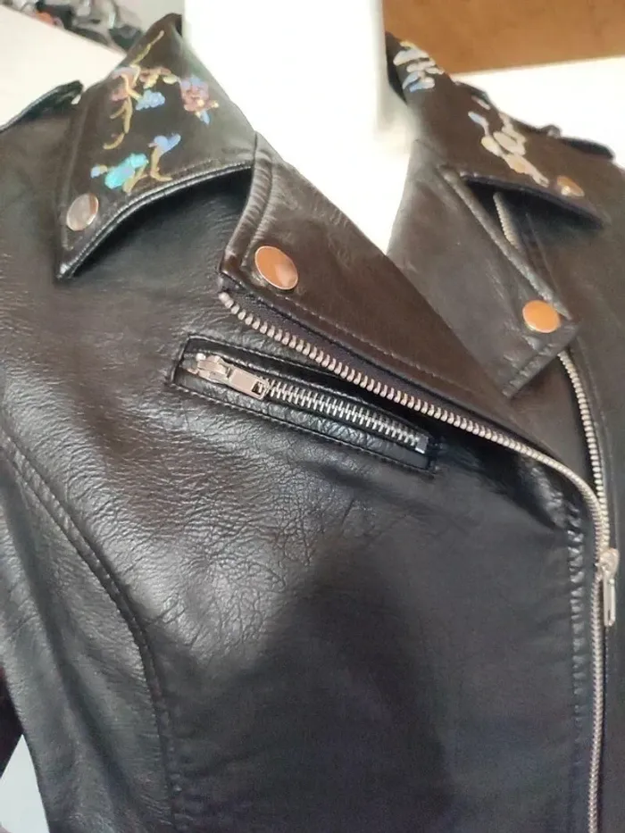 Perfecto noir avec motifs floraux brodés. Fermeture zippée décalée. 2 poches et bout des manches zippées. Porté une fois. État neuf. Étiquette coupée. Marque BPC Bon prix collection
