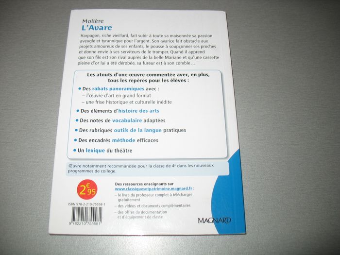 #Livres_Nathg2210 LIVRE : L'AVARE "CLASSIQUES & PATRIMOINE" - n°43 Livre de poche : L'avare - Auteur : Molière - Éditions Classiques & Patrimoine Magnard - Texte intégral - ISBN : 978-2-210-75558-1. Article d’occasion en très bon état – Couverture désinfectée pour la vente. Possibilité d'envoyer d'autres photos sur simple demande. Maison non-fumeur - Sans animaux. Réduction lot activée. Allez voir mes autres ventes, je vide les placards. Beaucoup de vêtements de marque et beaucoup de jouets. Remise en mains propres ou possibilité d'envoi au tarif en vigueur à votre charge. Retour Refusé. Pour tout renseignement, n'hésitez pas à me contacter, je répondrai volontiers à vos questions. Réponse Assurée. Pour Consulter mes autres annonces tapez Nathg2210.