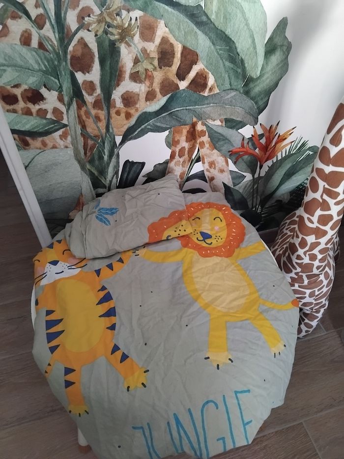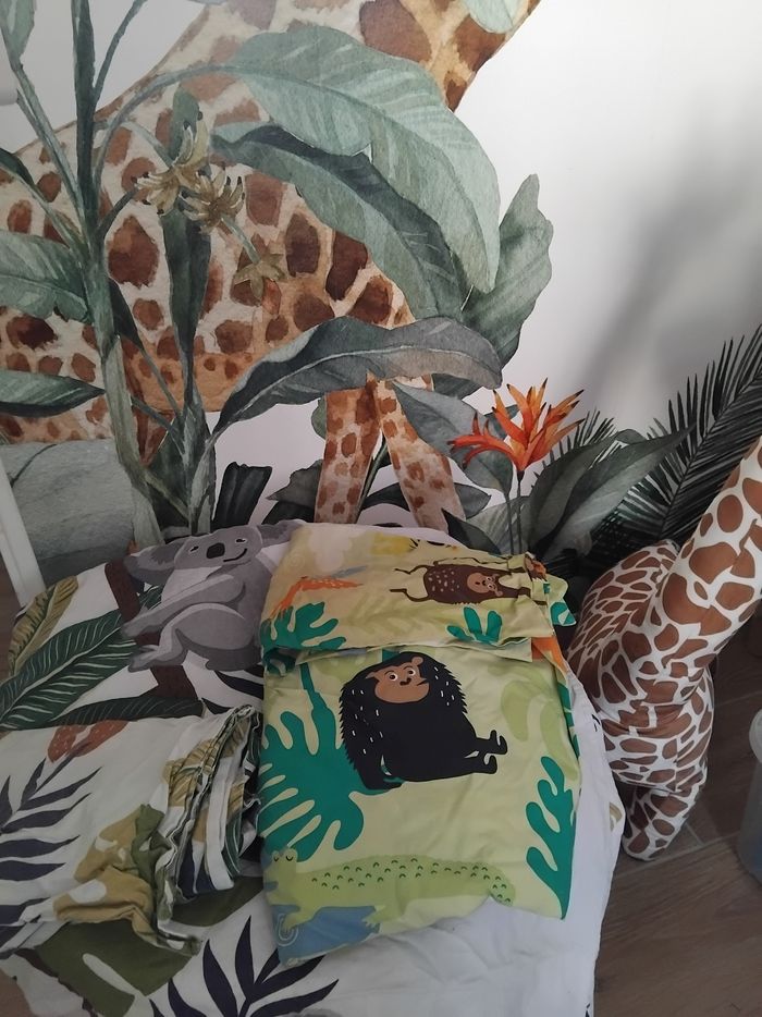 Lot de 3 housse de couette thème jungle avec taie d oreiller. Une housse a la fermeture du bas casser.