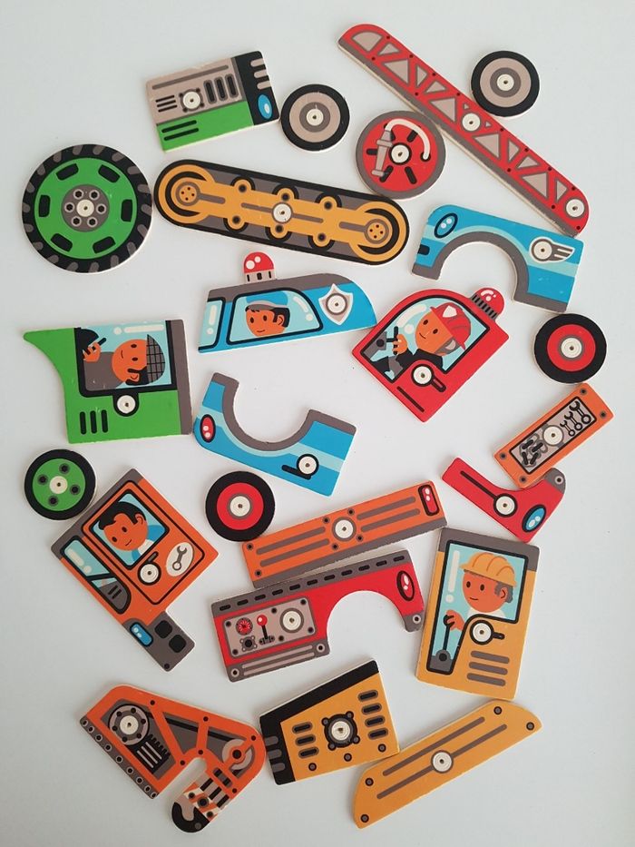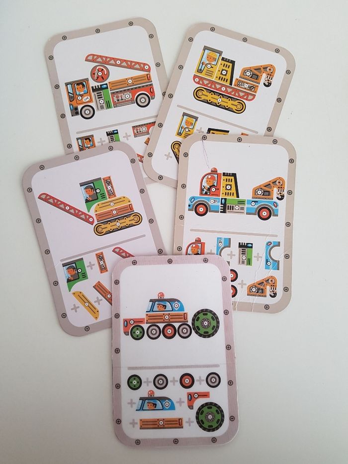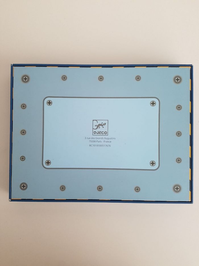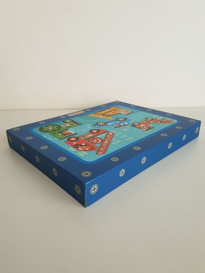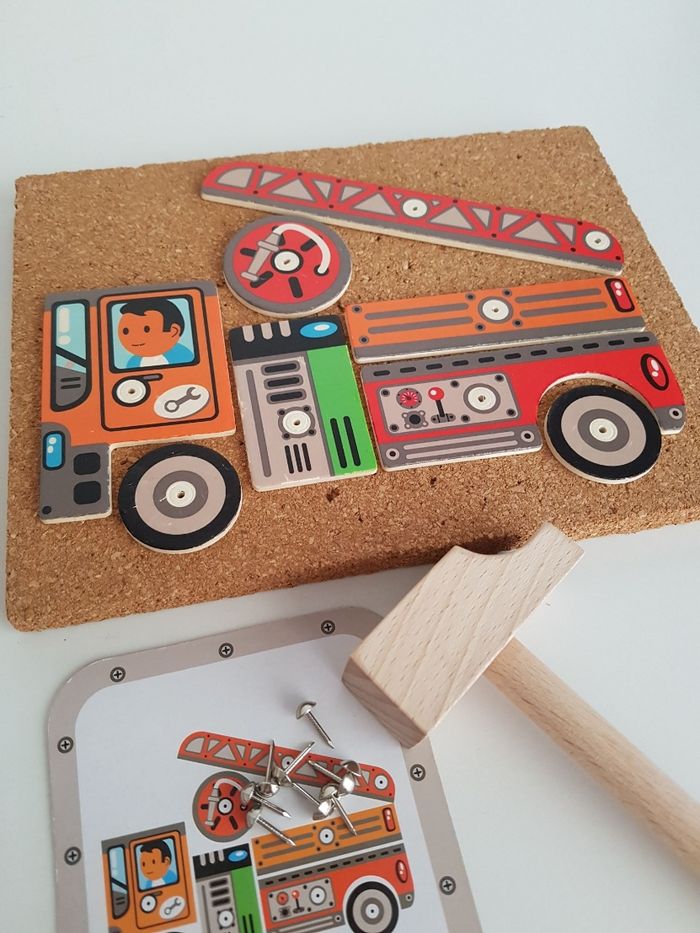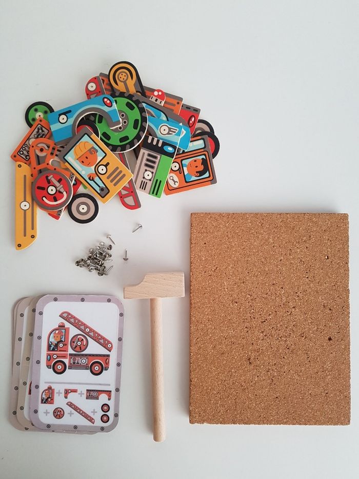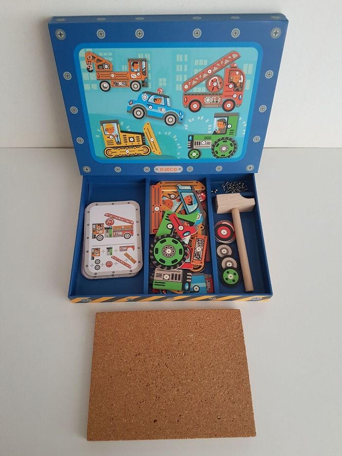 Le coffret Tape tape véhicules de Djeco est un jeu de de construction sur le thème des moyens de transport : camion de pompier, voiture de police, tracteur, pelleteuse ... Atelier de bricolage en bois pour assembler des véhicules avec des pièces plates illustrées et trouées, clouées sur une planche de liège. Il faut assembler toutes les pièces sur la plaque de liège et les fixer avec des petits clous. Un jeu éducatif montessori qui demande un geste précis pour taper sur les petits clous, permet de développer motricité fine, observation, notion de tri et organisation dans l'espace. Possibilité de suivre les modèles ou d'inventer les siens pour développer l'imagination COMPLET : 1 marteau en bois, 1 planche de liège, 5 cartes recto-verso 10 modèles, 24 pièces en bois et des clous Un angle du coffret et 2 cartes sont abîmés. Dimensions du support en liège : 21 × 16 cm Longueur du marteau : 16,5 cm