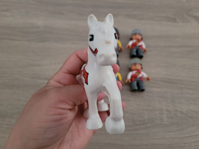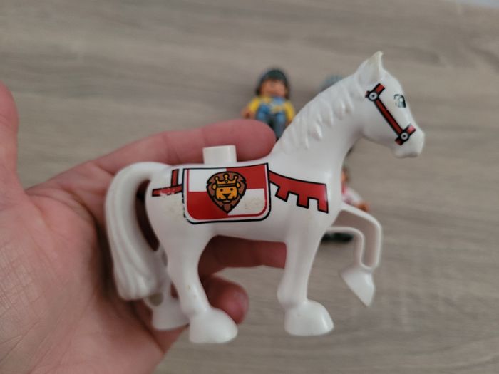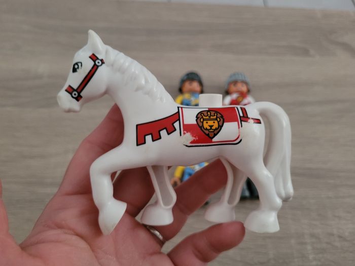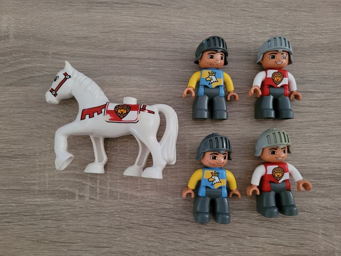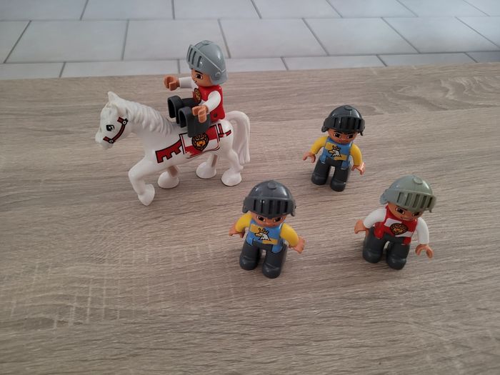Vend lot de 4 chevaliers et un cheval Duplo en bon état juste des signes d'usures liés au jeu (voir photos). Vendu tel que sur la publication.