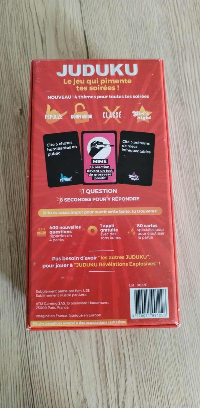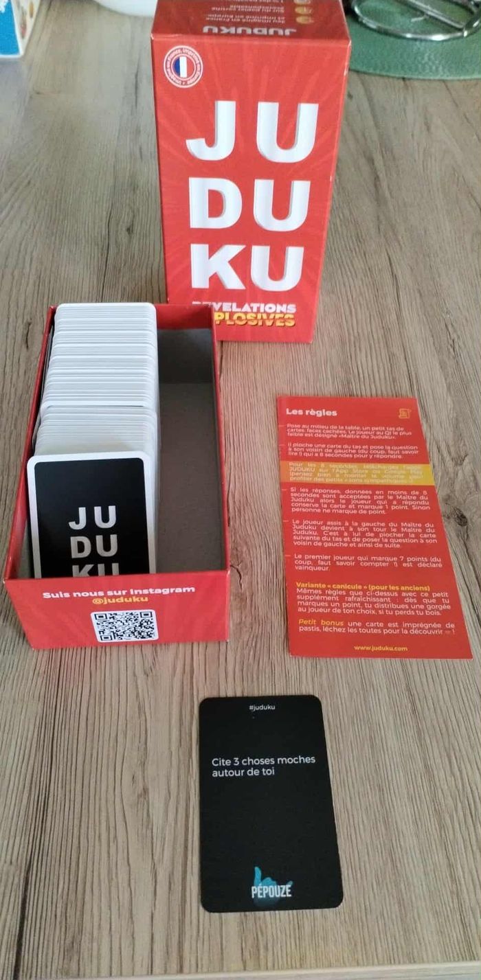 Juduku, le jeu qui pimente tes soirées ! Révèle, en 8 secondes, les pires pensées de tes ami(e)s de ta famille et d’illustres inconnu(e)s avec des cartes demandant de la spontanéité, peu de morale et aucune retenue ! 16+ Utilisé qu'une fois - comme neuf. Tous mes jeux/jouets ici : #veuvenoire_jeuxjouets Tous mes jeux de société ici : #veuvenoire_jeuxsociete #jeudesociete #dujardinjeu #jeudecartes #jeurigolo