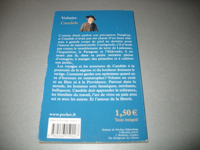 #Livres_Nathg2210 LIVRE : CANDIDE "POCKET" - n°54 Livre de poche : Candide - Éditions Pocket - Auteur : Voltaire - ISBN : 978-2-266-15922-7. Article en très bon état - Couverture désinfectée pour la vente. Possibilité d'envoyer d'autres photos sur simple demande. Maison non-fumeur - Sans animaux. Réduction lot activée. Allez voir mes autres ventes, je vide les placards. Beaucoup de vêtements de marque et beaucoup de jouets. Remise en mains propres ou possibilité d'envoi au tarif en vigueur à votre charge. Retour Refusé. Pour tout renseignement, n'hésitez pas à me contacter, je répondrai volontiers à vos questions. Réponse Assurée. Pour Consulter mes autres annonces tapez Nathg2210.