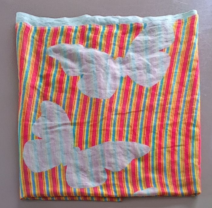 Foulard de couleur bleu jaune rouge pour femme. Foulard avec motif de papillon couleur vert pomme. Foulard de longueur 174 cm et de largeur 108 cm Article en bon état, expédition rapide Prix 3€