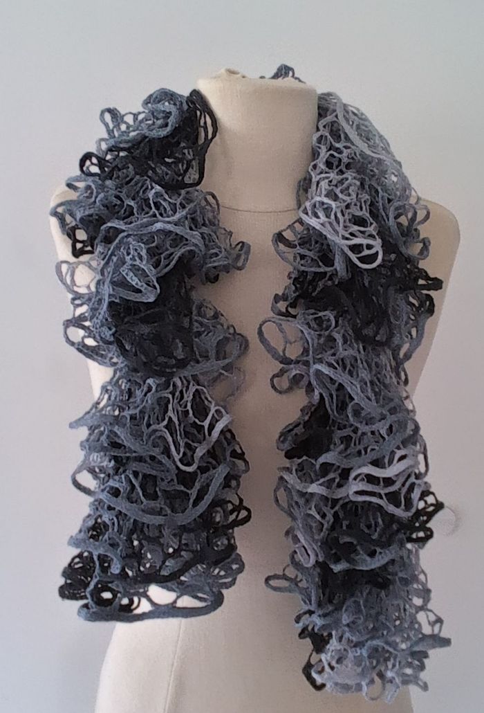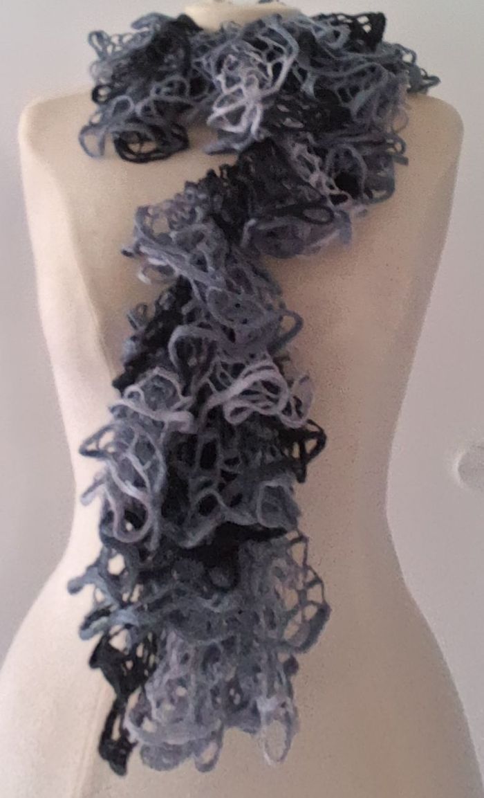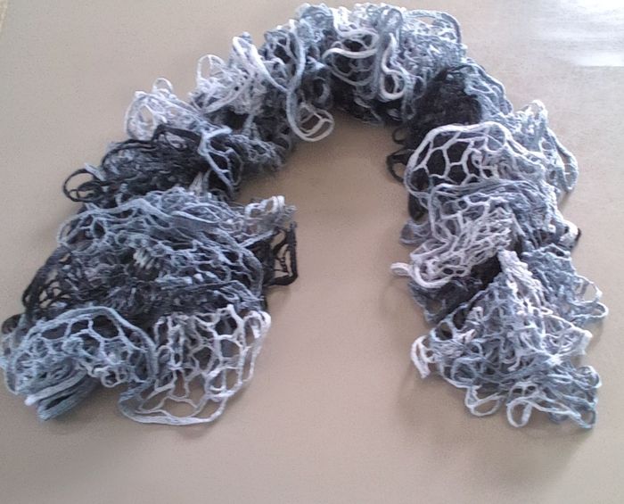Echarpe fait main de couleur gris et noir pour femme Echarpe de longueur 93 cm. Article bon état, expédition rapide Prix 2€