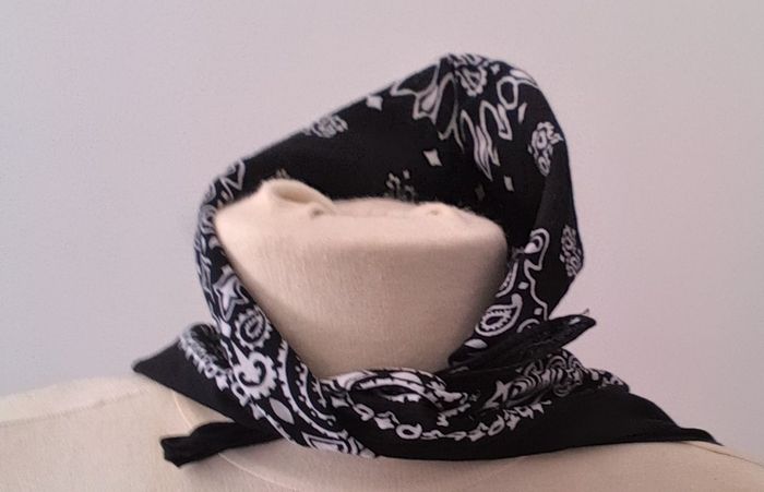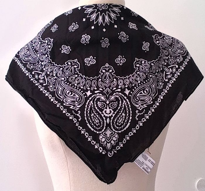 Foulard de couloir noir et motif en blanc, de la marque Zeeman. Foulard en 100 % de coton pour femme Dimension 51cm*50cm Article en bon état, expédition rapide Prix 2€