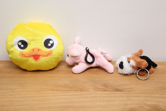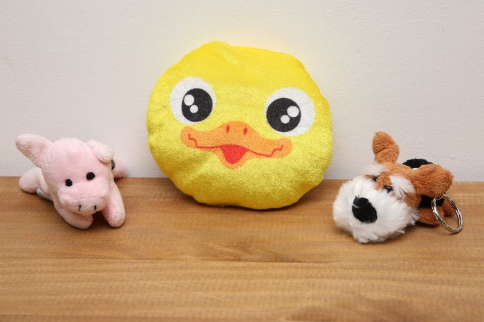 1 peluche/petit coussin et 2 porte clés