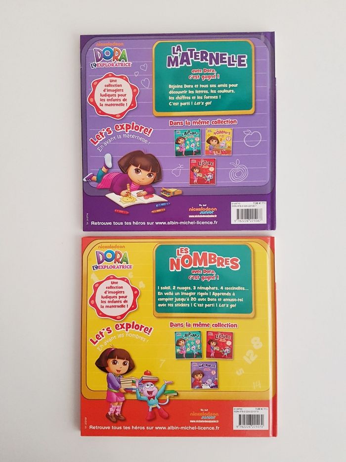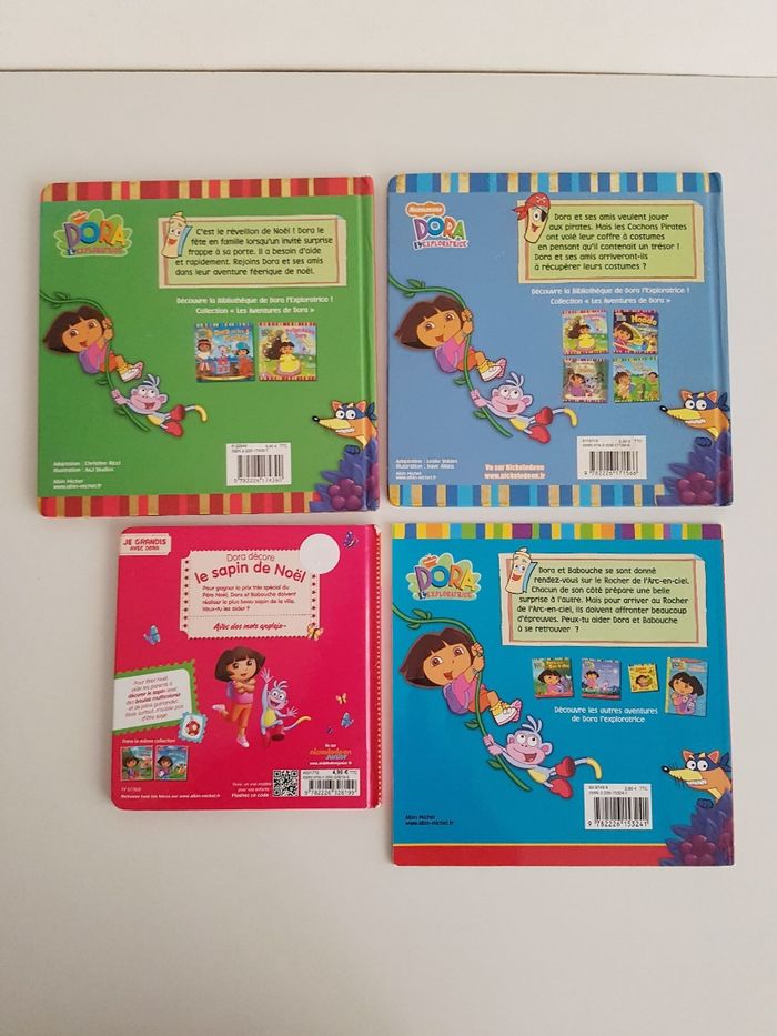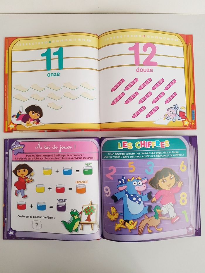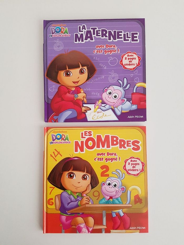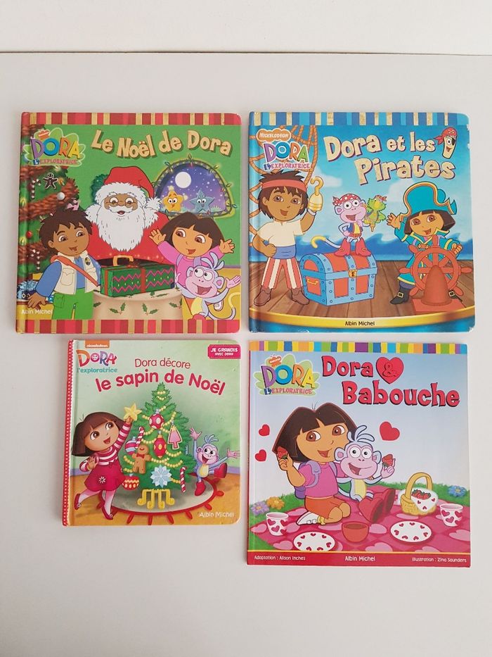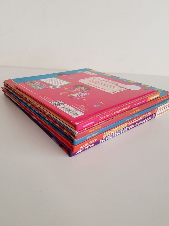 Lot de 6 livres de Dora l'exploratrice, la petite fille bilingue français anglais Éditions Albin Michel • Le Noël de Dora, pages plastifiées Dora et ses amis aident le père-Noël à distribuer les cadeaux avec le traîneau Dimensions : 21 × 21 cm • Dora et les pirates, pages plastifiées Voyage sur les mers pour une course au trésor • La maternelle avec Dora c'est gagné ! Découverte des lettres, couleurs, chiffres et formes Des activités ont été faites (autocollants collés) Dimensions : 22 × 22 cm • Les nombres avec Dora c'est gagné ! comme neuf Reconnaître les chiffres et apprendre à compter. Avec 2 pages de stickers • Dora décore le sapin de Noël Petit format avec les pages plastifiées, couverture abîmée Dimensions : 16 × 16,5 cm • Dora & Babouche, album souple Une aventure jusqu'au rocher arc-en-ciel