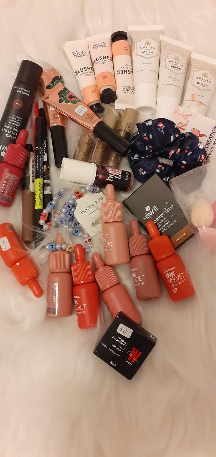 Je vends le lot,différents articles 1 fond de teint à l'huile de jojoba bio 3 blush crème Apicia Paris 8 gloss à lèvres permanents 3 blush Mua 2 fards à paupières à l'huile de sésame 3 crayon 1 fard à paupières miss pro 1 correcteur Avril 3 fards à Paupières avec paillettes Etc