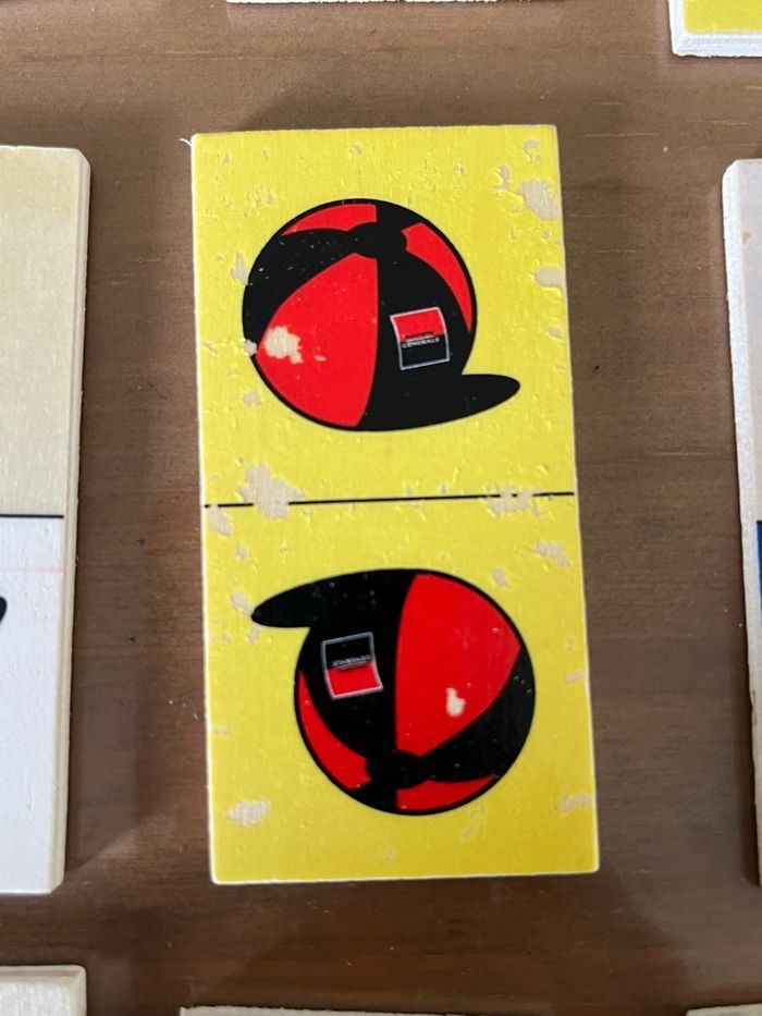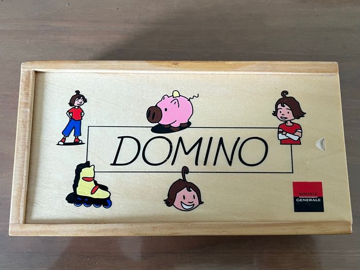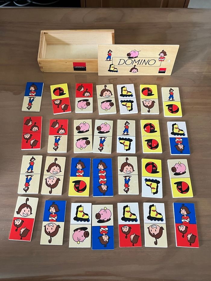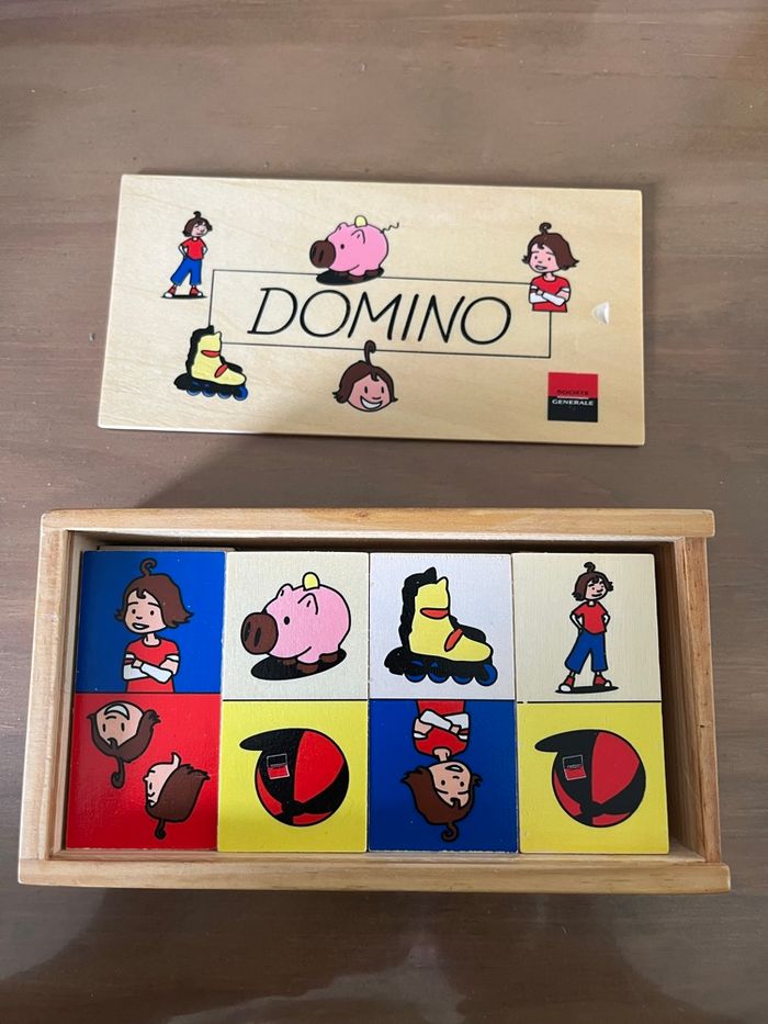Jeu ayant servi mais complet et en très bon état. Un seul domino est un peu abîmé ( voir photo ). 28 dominos en bois avec personnages et sa boîte de rangement.