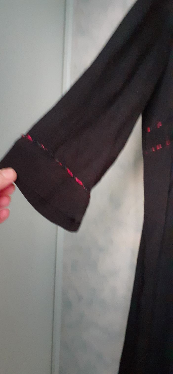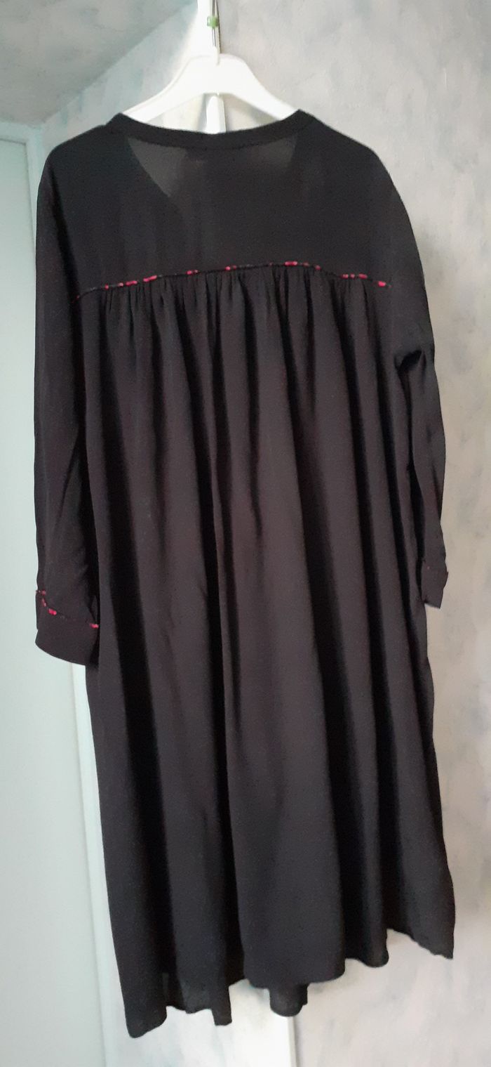Vends une robe manches 3/4, fluide, 100 % viscose, non doublée, empiècement sous la poitrine et évasée ensuite, couleur noir avec un petit liseré rouge sous la poitrine et au bas des manches, fermeture éclair sur le buste, marque Promod, taille 40 sur l'étiquette mais taille grand 42-44.