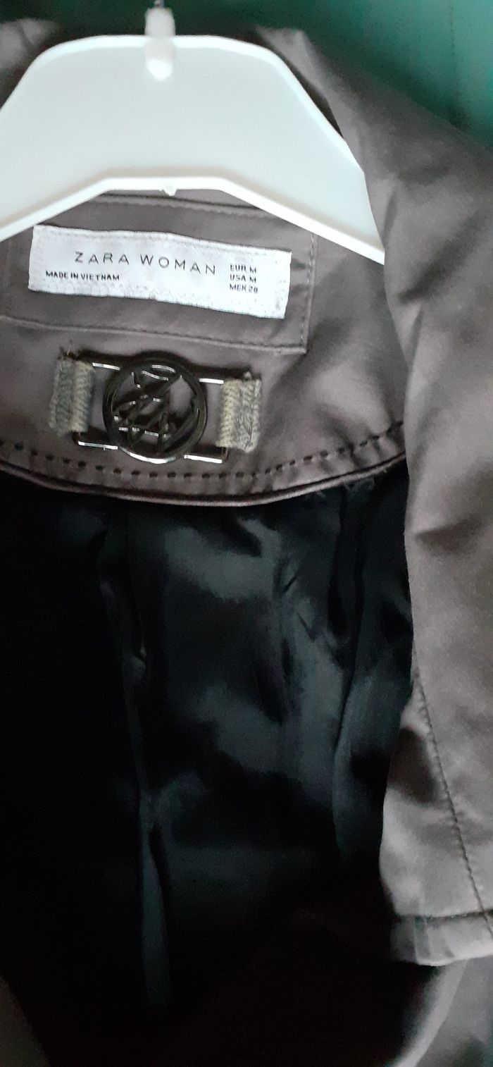 Vends une veste coupe cintrée 97 % coton 3 % spandex, doublée, épaulettes, fermeture par boutons et grosse ceinture, couleur gris/taupe, doublure noire, marque Zara Woman, taille M. Longueur de l'épaule à la base : 56 cm Largeur aisselle à aisselle : 44 cm.