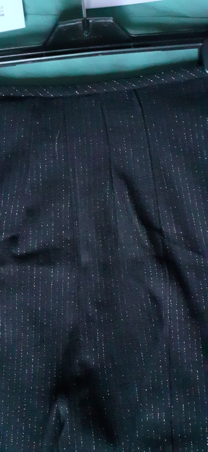 Vends un pantalon 97 % laine, 2 % viscose, 1 % élasthanne, sans braguette, fermeture éclair sur un côté, couleur noir avec fines rayures dorées, marque Betty Barclay, taille 42 sur l'étiquette mais au vu du tour de taille et du bassin, serait du 36/38. Longueur entrejambe : 69 cm Largeur de la ceinture à plat non étirable : 33 cm Largeur au niveau des hanches : 50 cm.