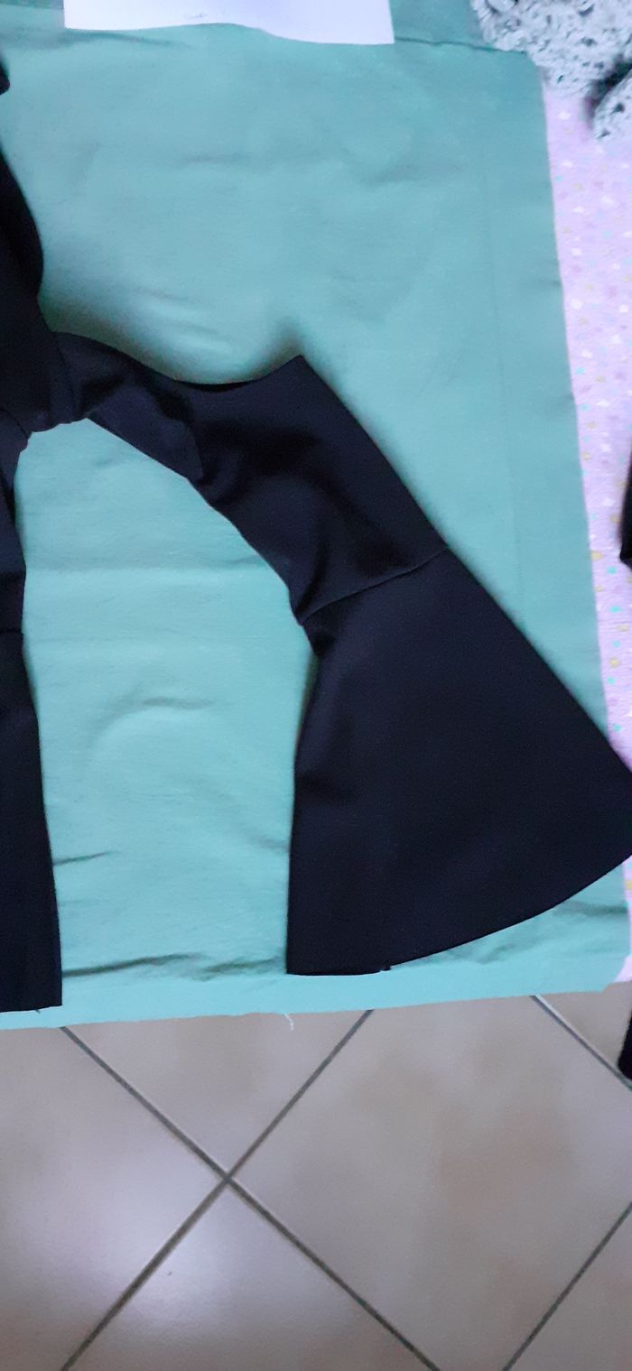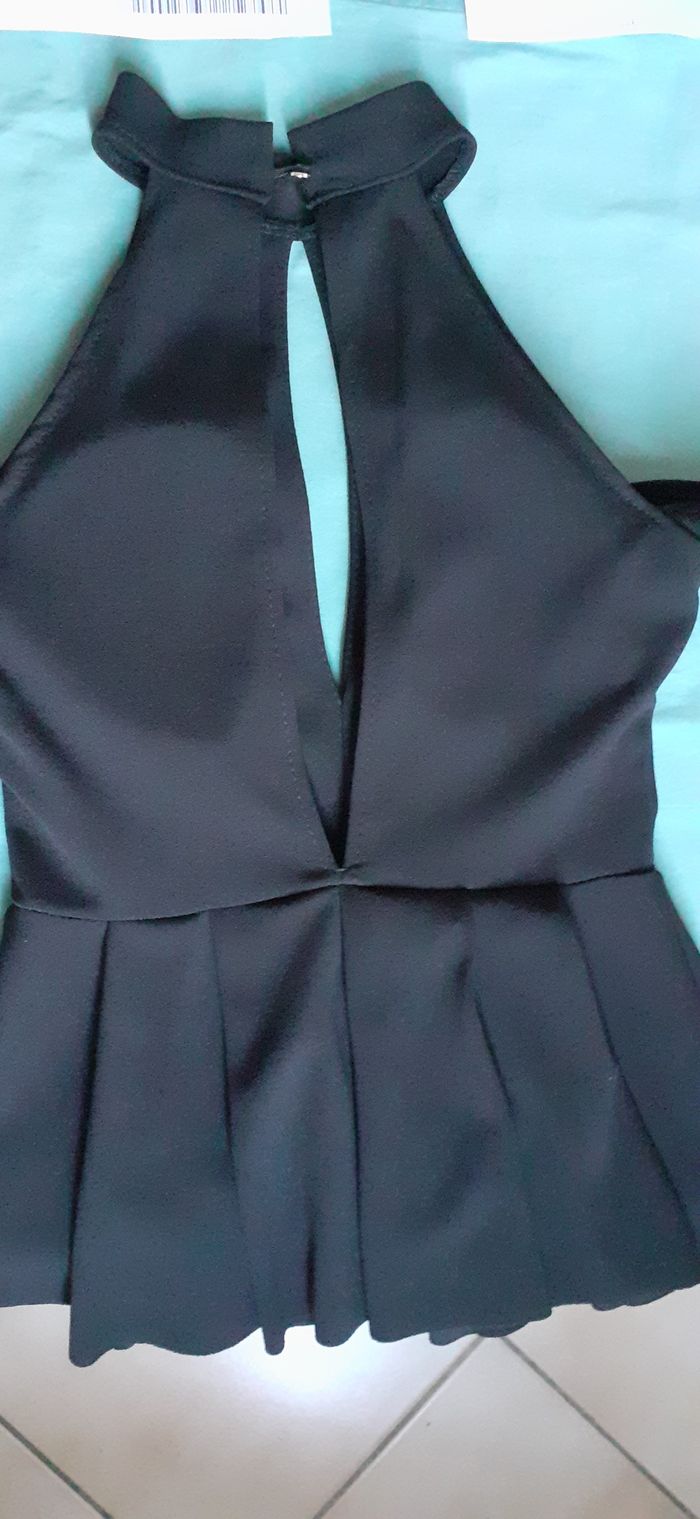 Vends une tunique originale courte, 95 % polyester 5 % élasthanne, manches terminées en éventail, épaules dénudées, décolleté profond en V devant et dans le dos, bonnets sur la poitrine, plissée à la base, bouton en métal argenté derrière le cou, couleur noir, taille 36. Longueur de l'épaule à la base : 55 cm Largeur aisselle à aisselle : 37 cm.