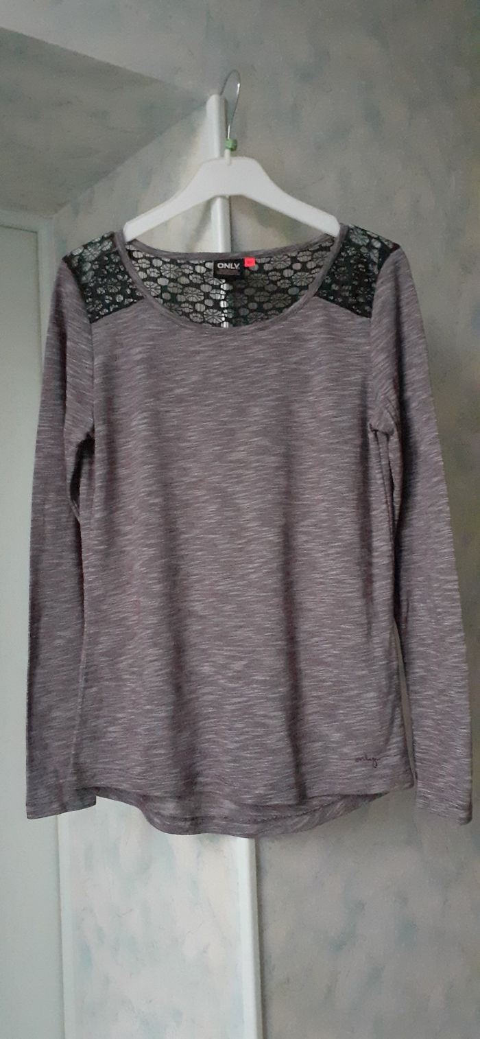 Vends un tee-shirt 50 % polyester, 50 % coton, plus long et arrondi à la base dans le dos, couleur taupe/marron, effet strié avec dentelle noire sur les épaules et le haut du dos, marque Only, taille XS.