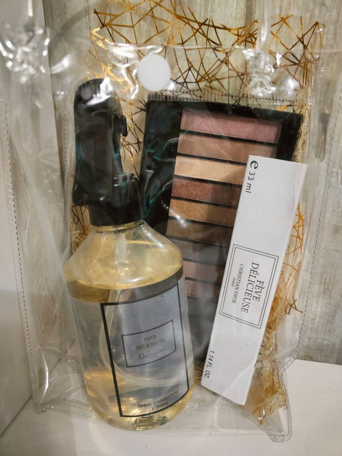Coffret femme neuf comprenant 1 parfum 1 palette de maquillage 1 spray désodorisant textile et voiture